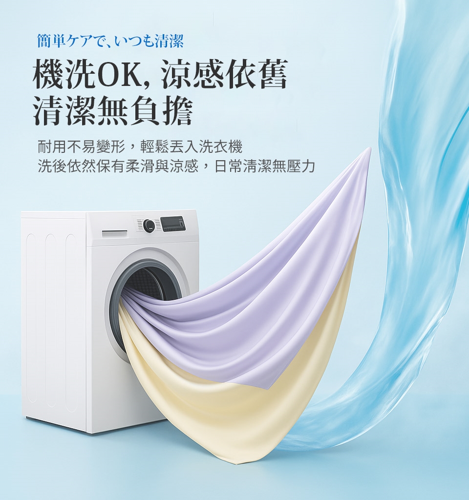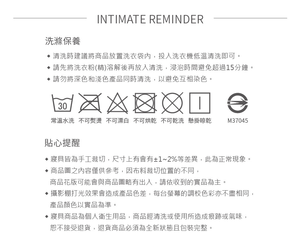 可水洗/不可烘乾/不可漂白/勿使用強力漂白清潔劑/浸泡時間請勿超過20分鐘/建議可放入大型洗衣袋後再清洗(因深色布料請勿使用含漂白劑之洗劑,盡量避免浸泡,深淺色寢具請分開清洗)
