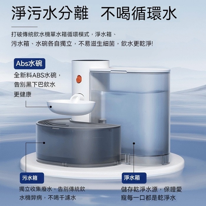 商品內容:主機*1/水碗*1/淨水箱*1/汙水箱*1/淨水蓋*1/汙水蓋*1/充電線*1/說明書*1
