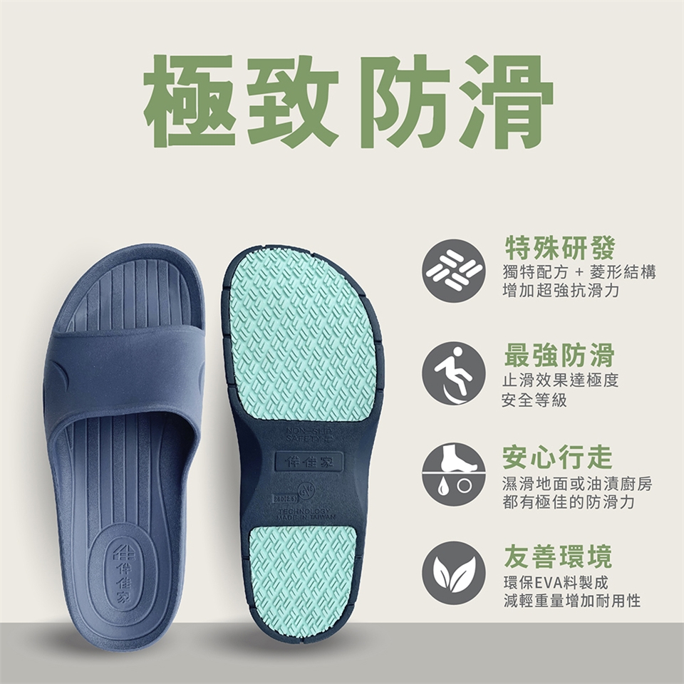 拖鞋雖使用防滑材質製作,不建議在濕滑(如清潔劑、肥皂水)地板使用,以避免危險。