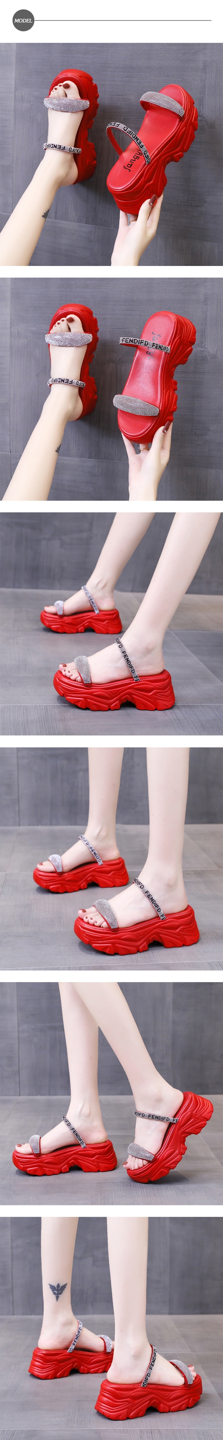 【HMH】美鑽一字帶厚底拖鞋/閃耀美鑽一字帶英文字句造型厚底拖鞋 女鞋 紅