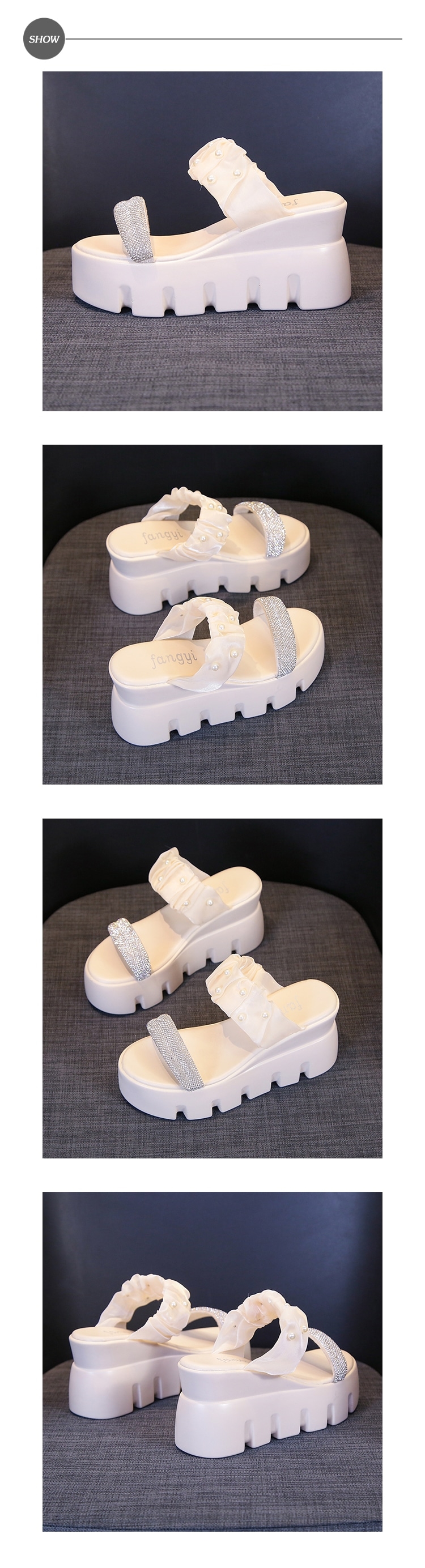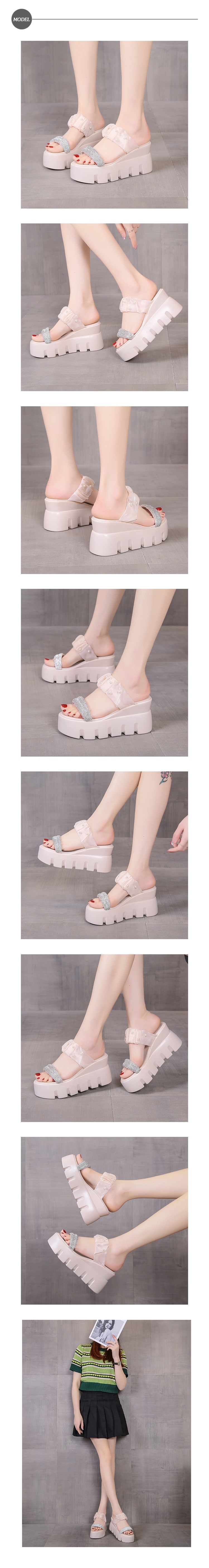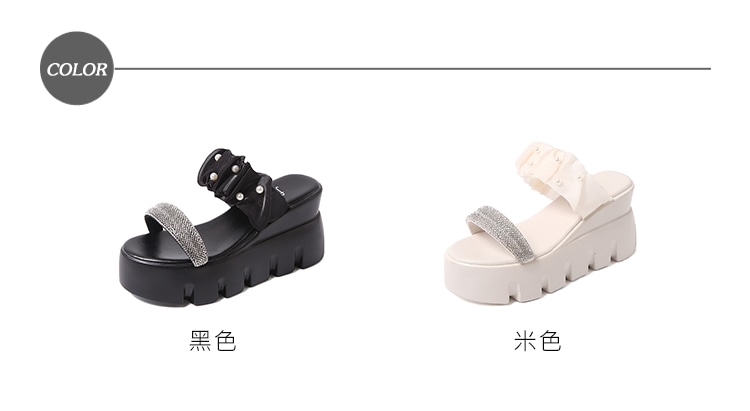 【HMH】鑽帶珍珠坡跟拖鞋/閃耀一字鑽帶珍珠造型坡跟拖鞋 女鞋 米