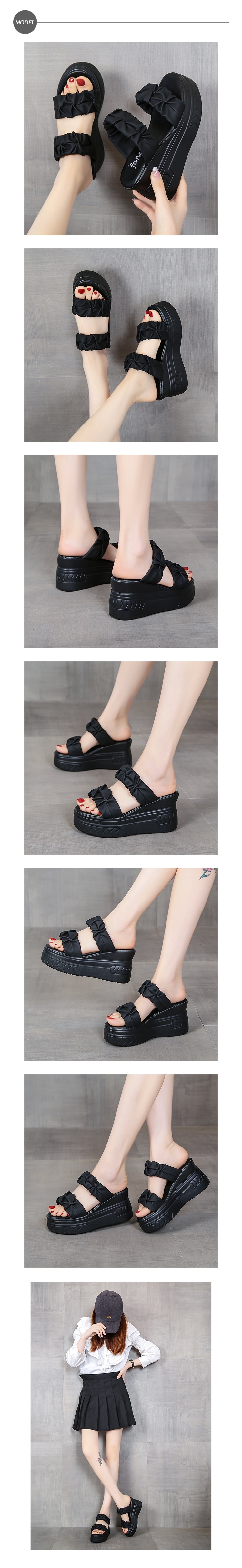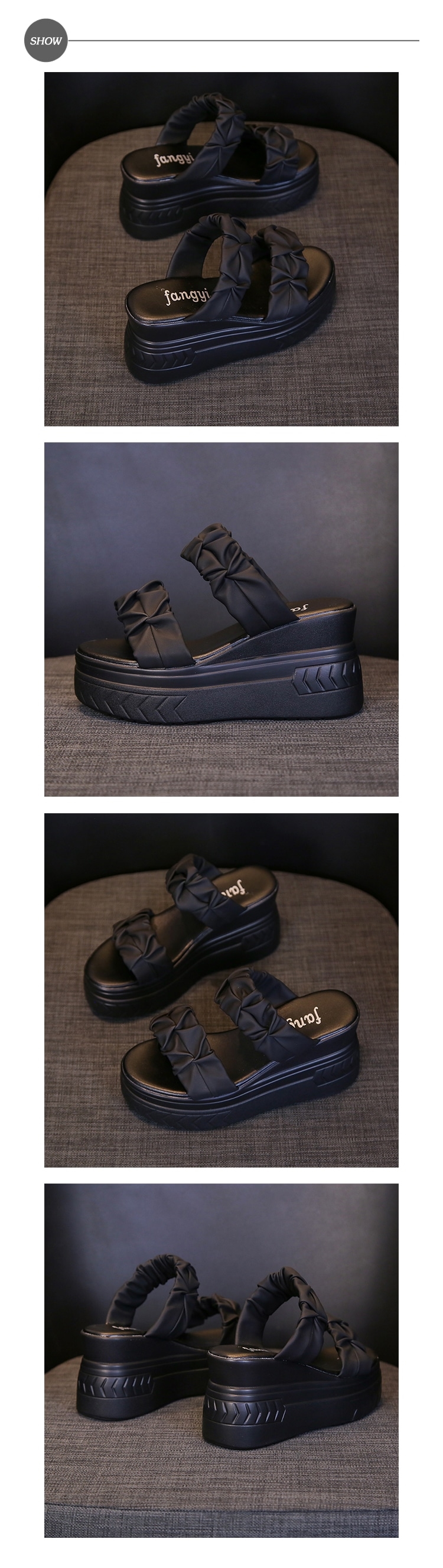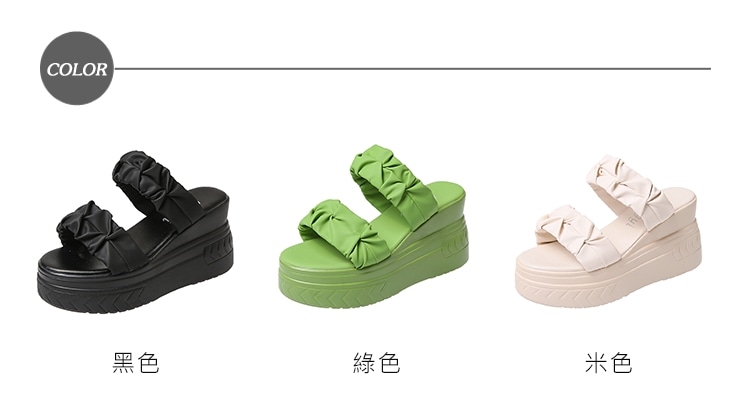 【HMH】緞面坡跟厚底拖鞋/寬版緞面抓褶一字帶造型坡跟厚底拖鞋 女鞋 黑