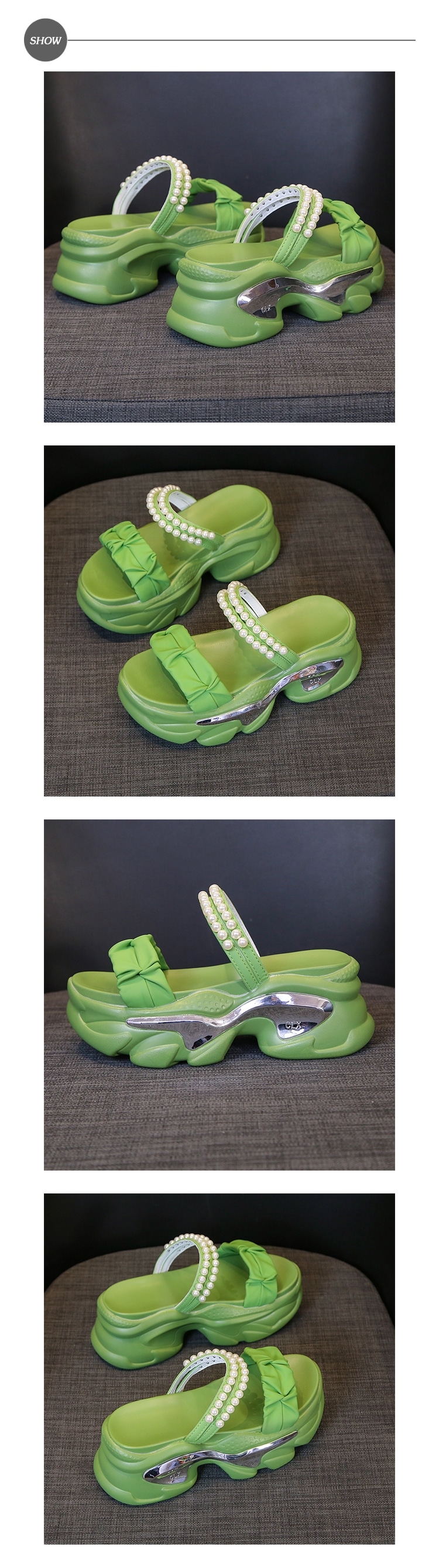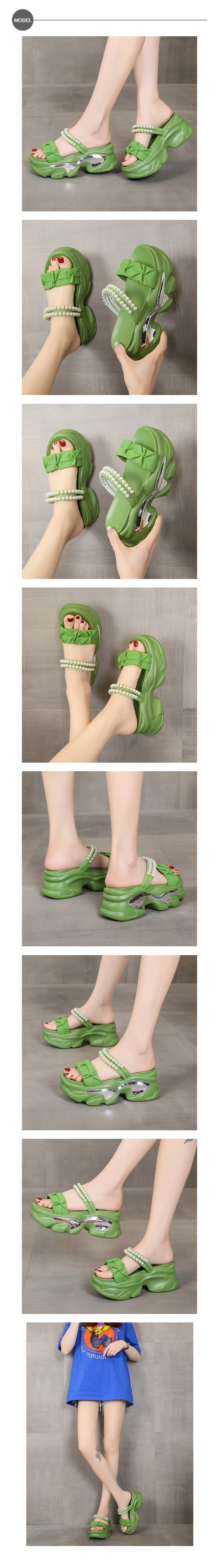 【HMH】緞面珍珠厚底涼拖鞋/優雅緞面一字帶珍珠鍊帶造型坡跟厚底涼拖鞋 女鞋 綠