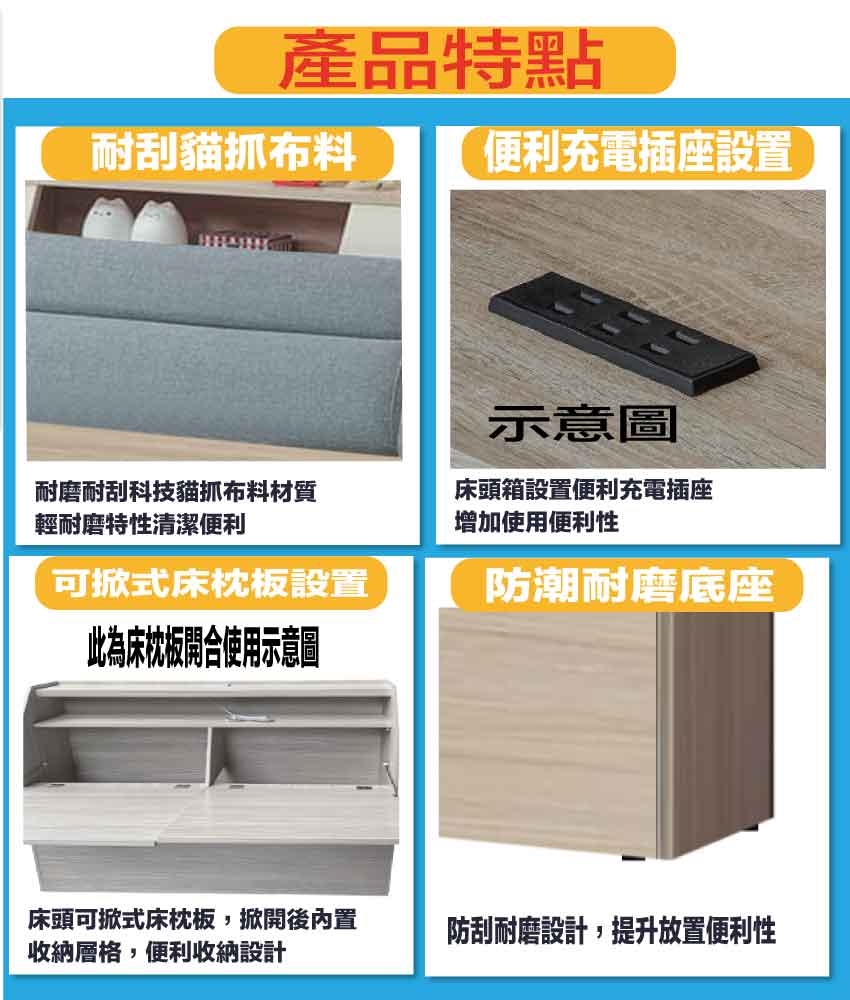 搭配床頭箱可掀式床枕板+內&外收納層格+便利插座設置等收納空間設計