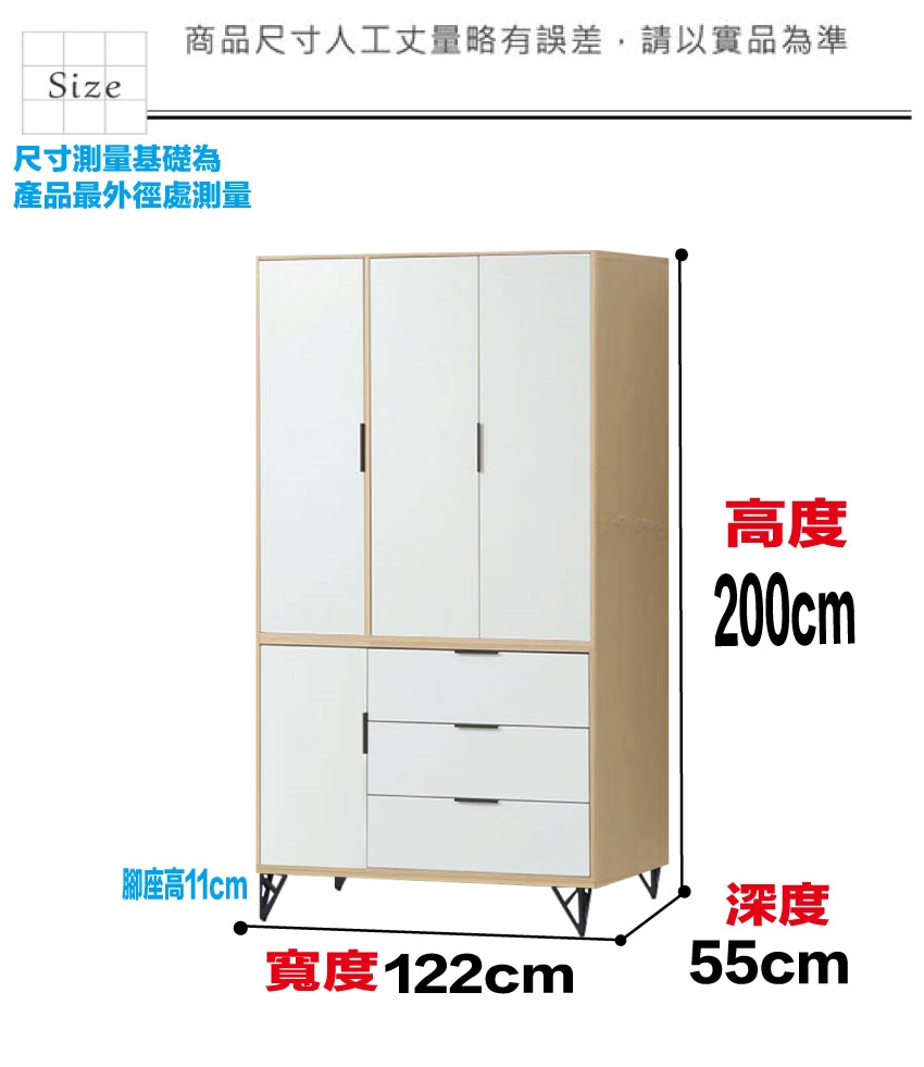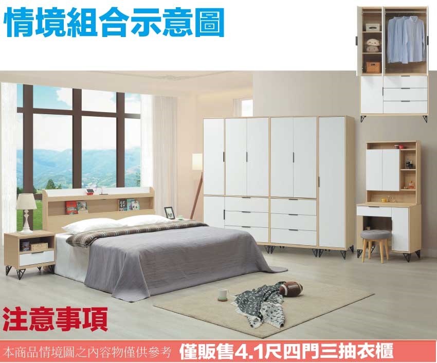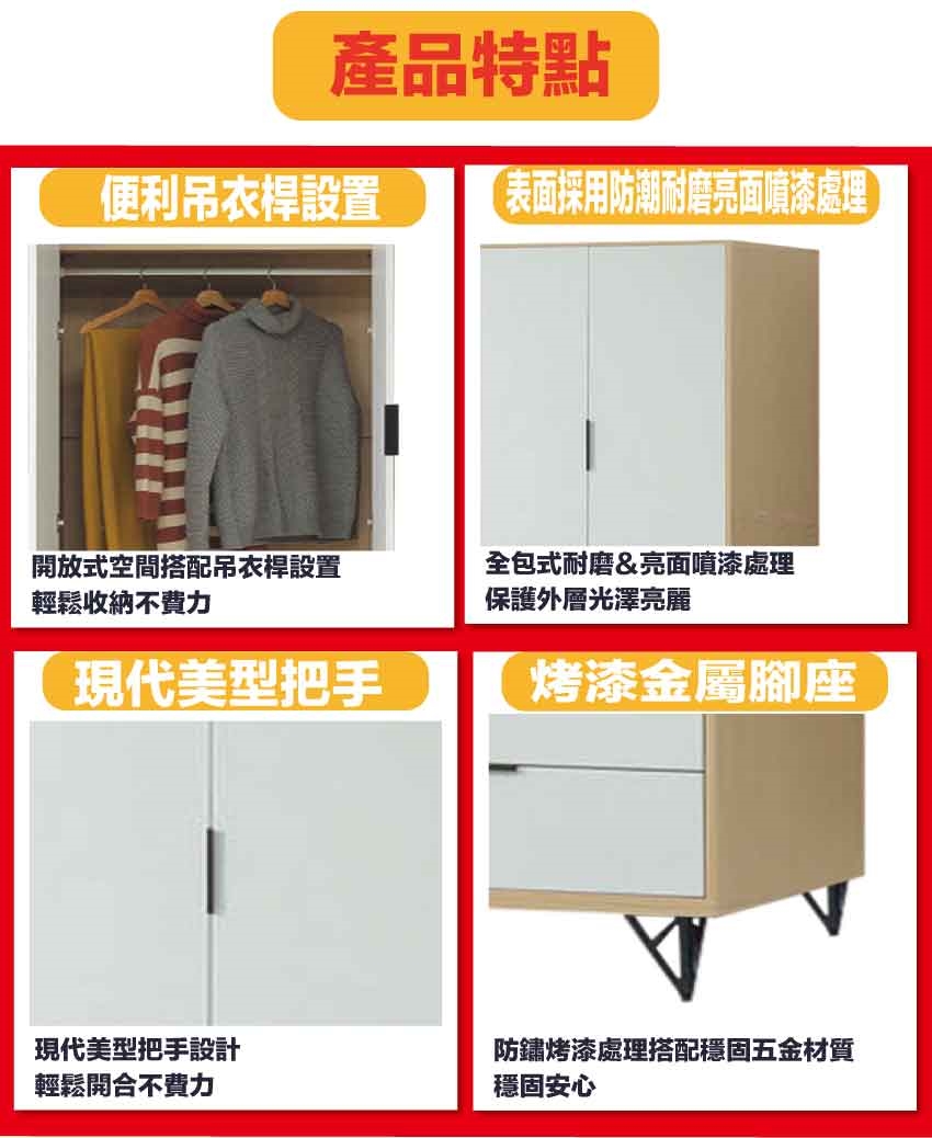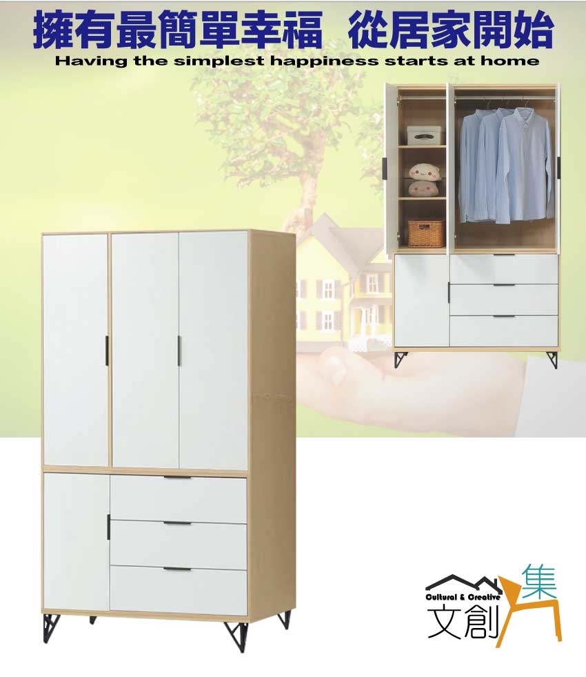 【文創集】普伊斯4尺四門三抽鐵腳衣櫃 木紋雙色系+安心材質製造,使用放心+搭配居家更便利,採用防蛀木心板+五金滑軌結構+烤漆五金腳座+防夾手緩衝五金等安心材質製造 ,外層採用防潮耐磨噴漆處理搭配採用開門櫃+吊衣桿+三抽屜+內開放層格等收納空間設計,全由專人配送到家,專業安心服務,替你省下更多時間!