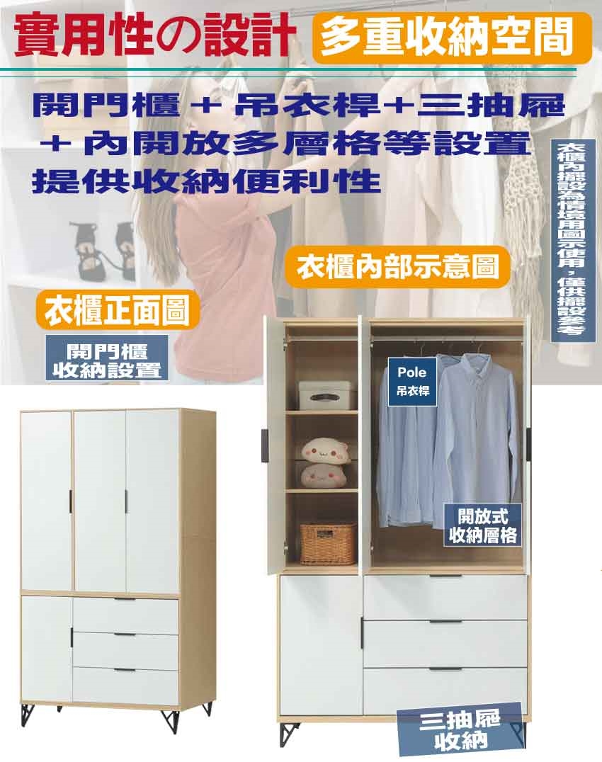 搭配採用開門櫃+吊衣桿+三抽屜+內開放層格等收納空間設計