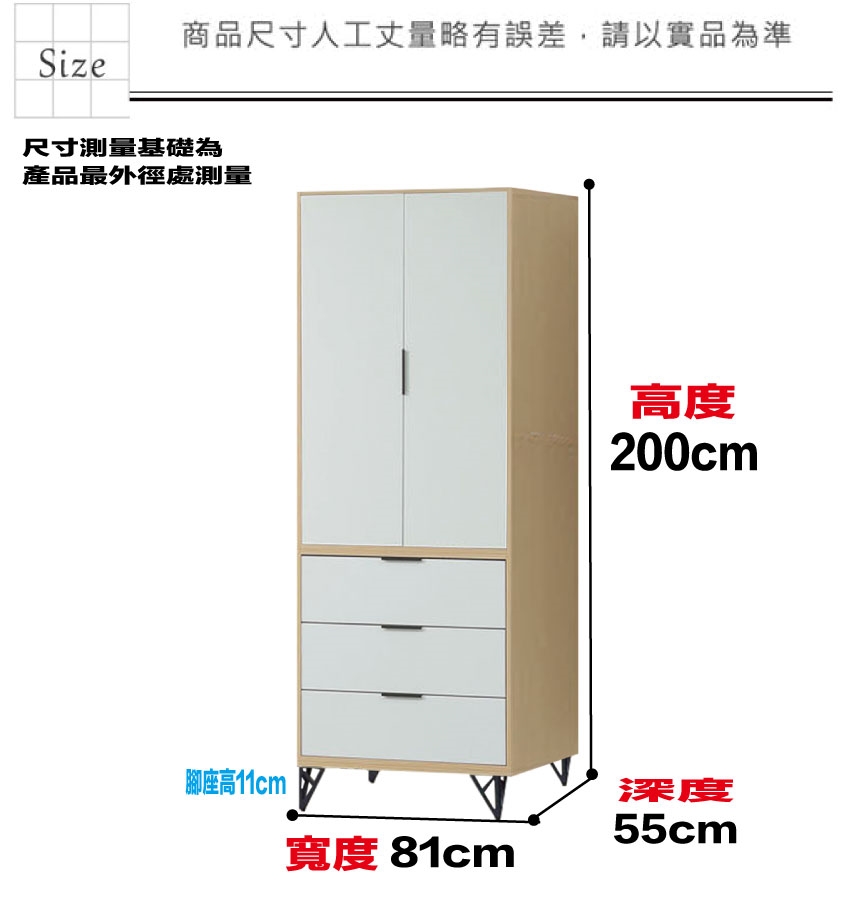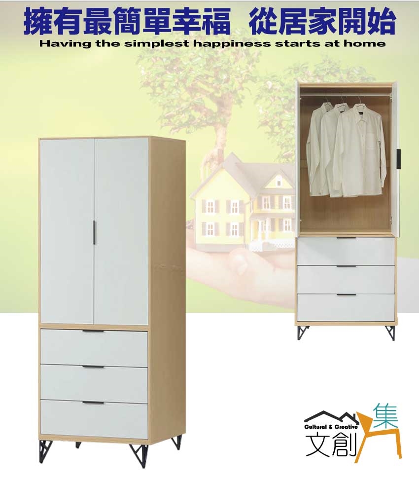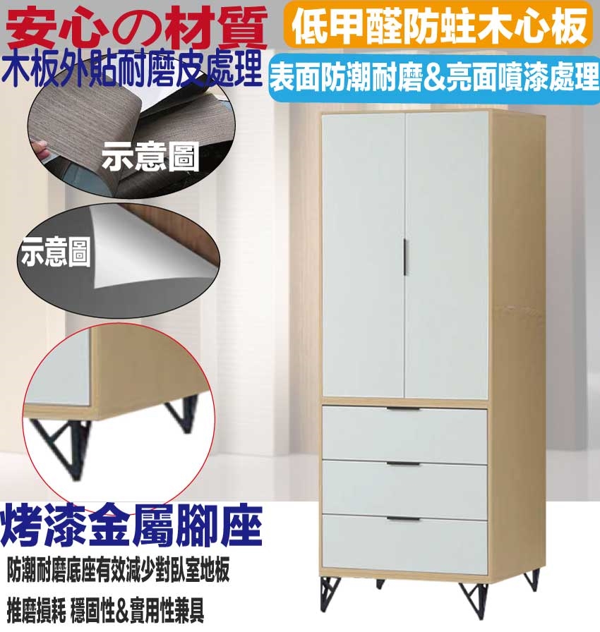 【文創集】普伊斯2.7尺二門三抽鐵腳衣櫃 木紋雙色系+安心材質製造,使用放心+搭配居家更便利,採用防蛀木心板+五金滑軌結構+烤漆五金腳座+防夾手緩衝五金等安心材質製造 ,外層採用防潮耐磨噴漆處理搭配採用開門櫃+吊衣桿+三抽屜+內開放層格等收納空間設計,全由專人配送到家,專業安心服務,替你省下更多時間!
