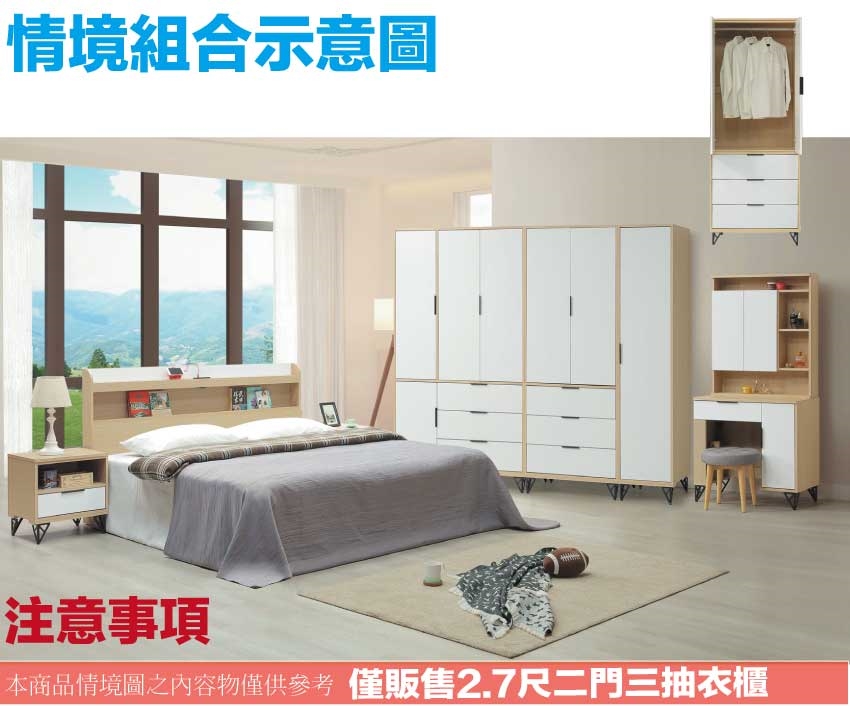 搭配採用開門櫃+吊衣桿+三抽屜+內開放層格等收納空間設計