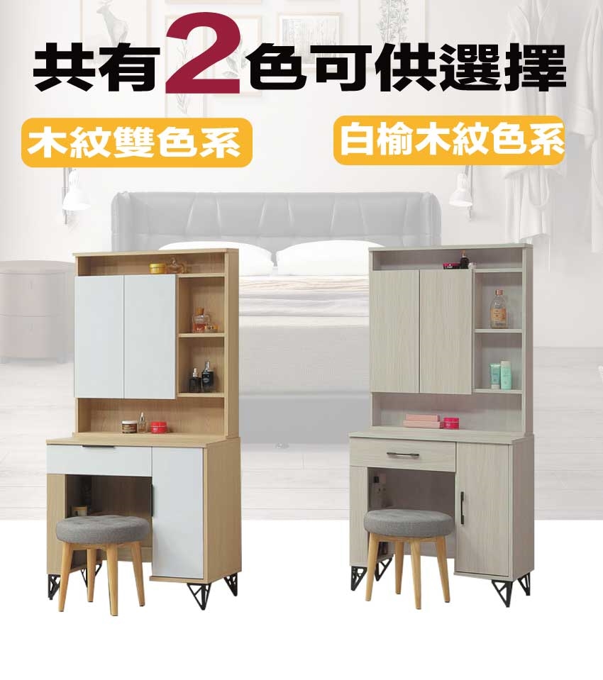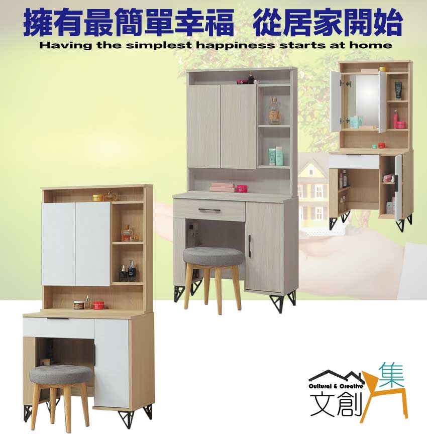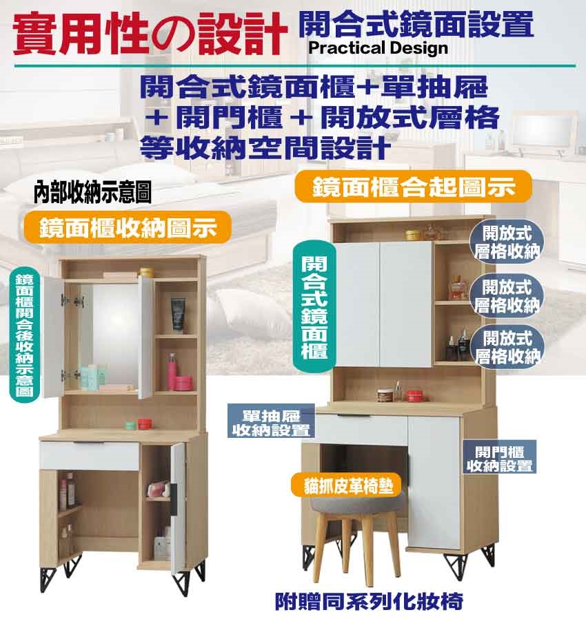 【文創集】普伊斯2.5尺開合鏡面鏡台組合(二色可選+含化妝椅) 二色可選+安心材質製造,使用放心+搭配居家更便利,採用防蛀木心板+烤漆五金腳座+強化玻璃鏡面等安心材質製造 ,外層採用防潮耐磨噴漆處理搭配採用開合鏡面櫃+開門櫃+單抽屜+內&外開放層格等收納空間設計,全由專人配送到家,專業安心服務,替你省下更多時間!