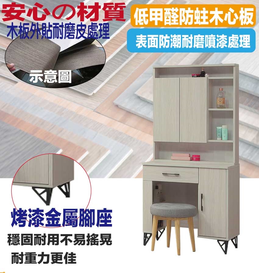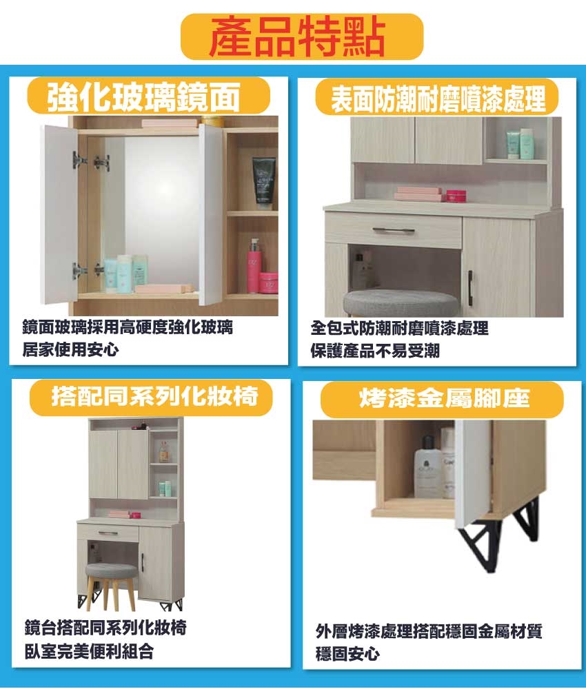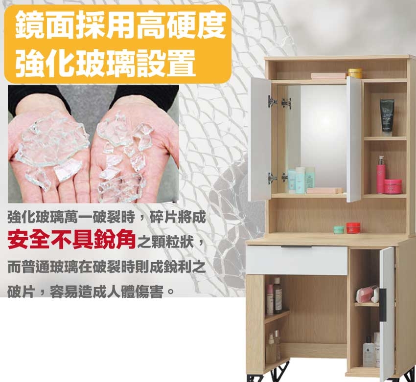 採用防蛀木心板+烤漆五金腳座+強化玻璃鏡面等安心材質製造
