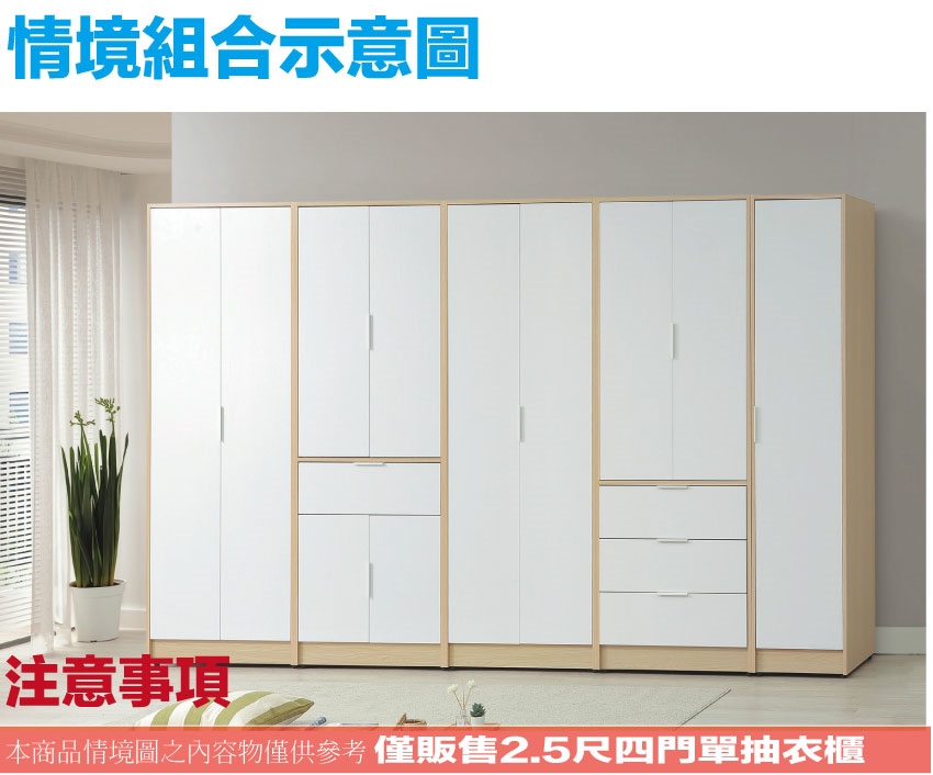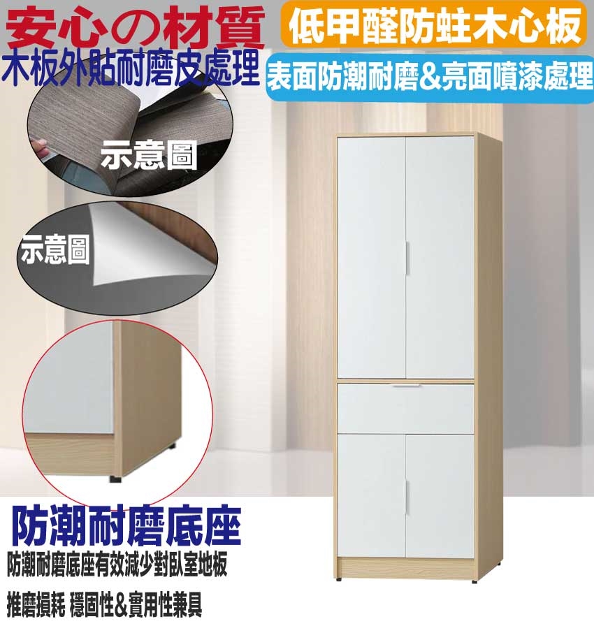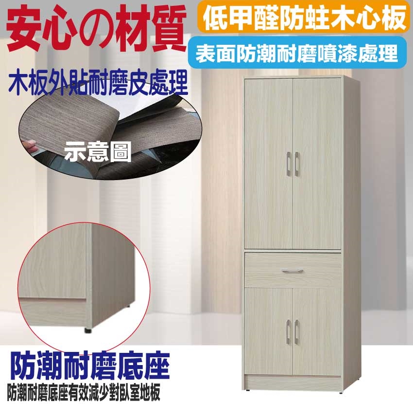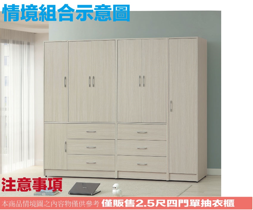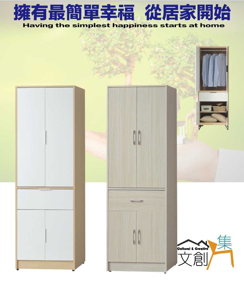 【文創集】普伊斯2.5尺四門單抽衣櫃(二色可選) 二色可選+安心材質製造,使用放心+搭配居家更便利,採用防蛀木心板+防潮耐磨底座+防夾手緩衝門片五金+五金滑軌結構等安心材質製造 ,外層採用防潮耐磨噴漆處理搭配採用開門櫃+吊衣桿+單抽屜+內開放層格等收納空間設計,全由專人配送到家,專業安心服務,替你省下更多時間!