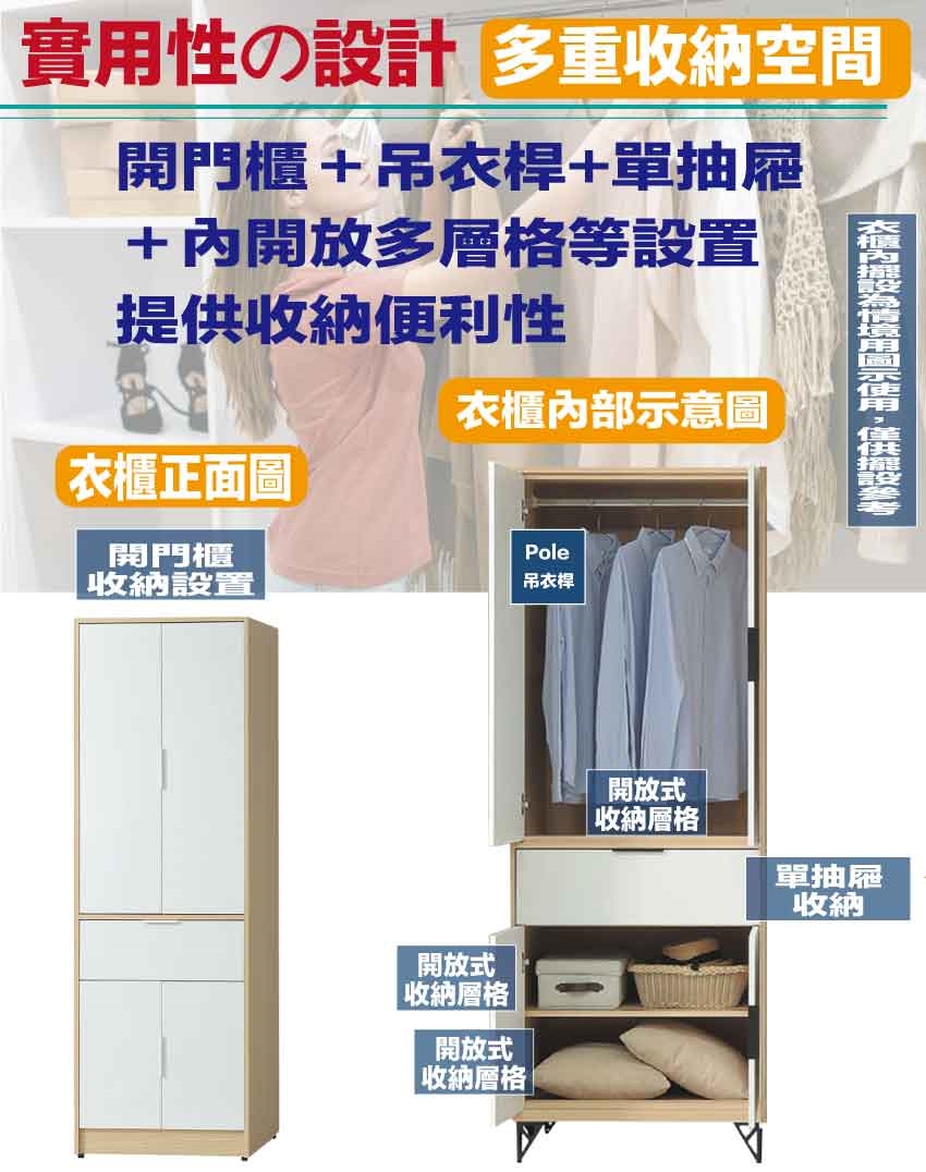 搭配採用開門櫃+吊衣桿+單抽屜+內開放層格等收納空間設計