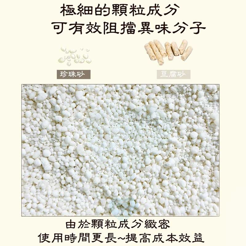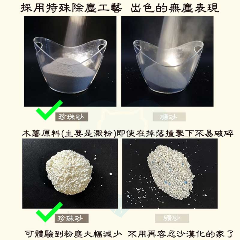 珍珠砂凝結更硬更輕,不黏底無粉塵,不傷貓砂盆,澱粉砂可溶解,清洗更方便
