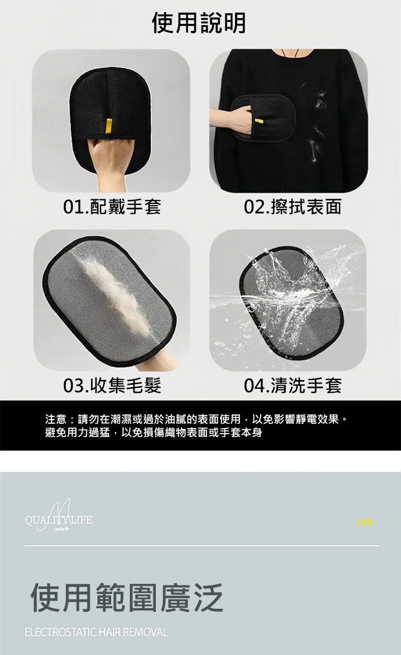 注:請勿在潮濕或過於油膩的表面使用,以免影響靜電效果。