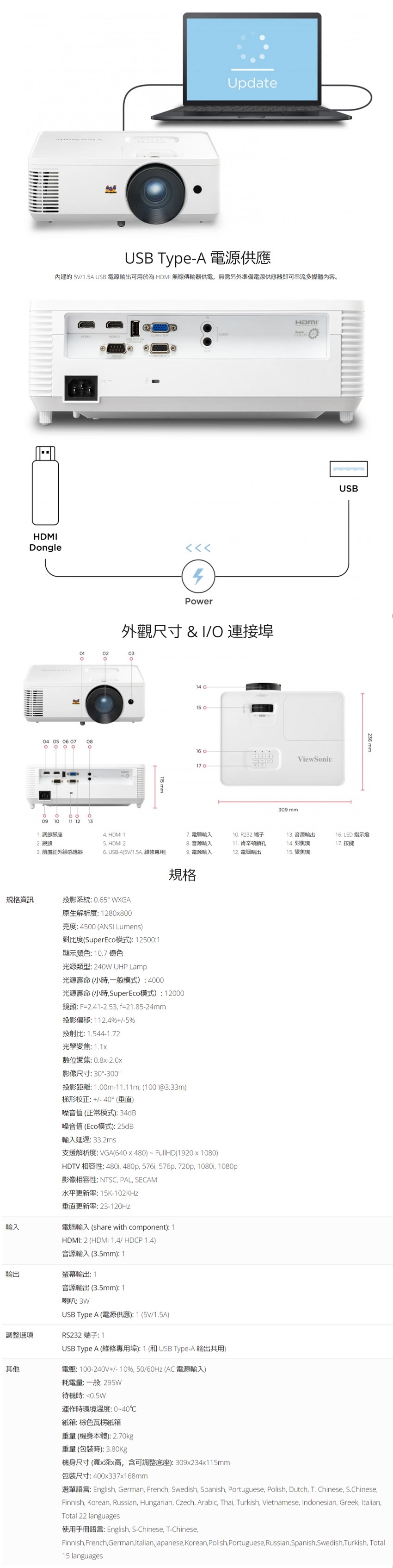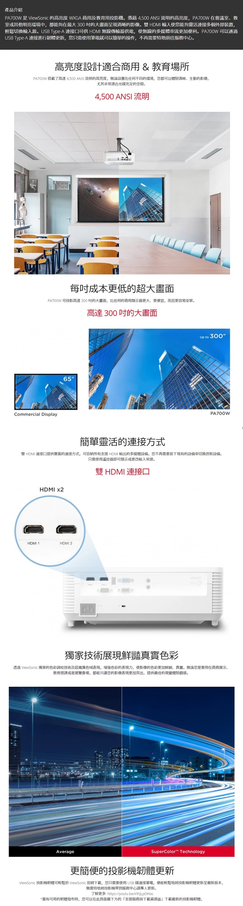 ViewSonic 優派 PA700W WXGA 商用&教育用投影機 4,500 流明
