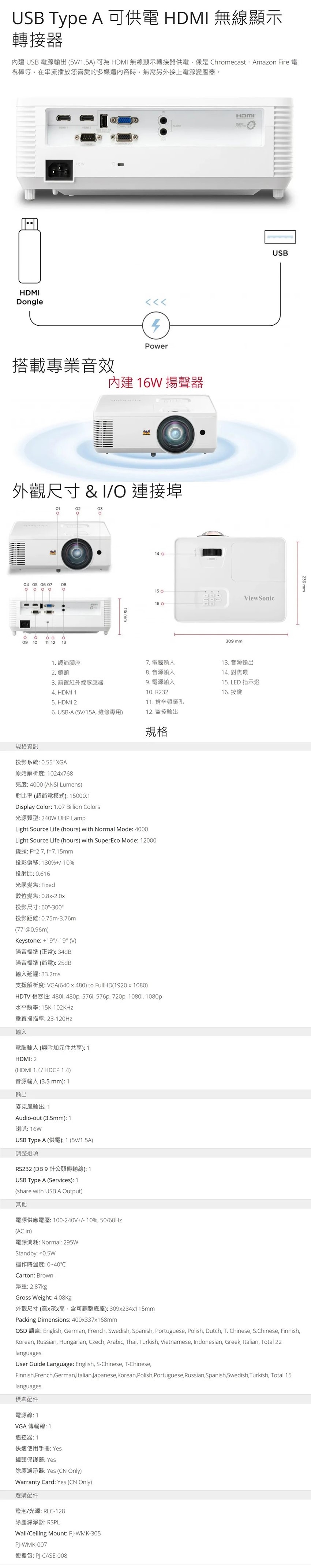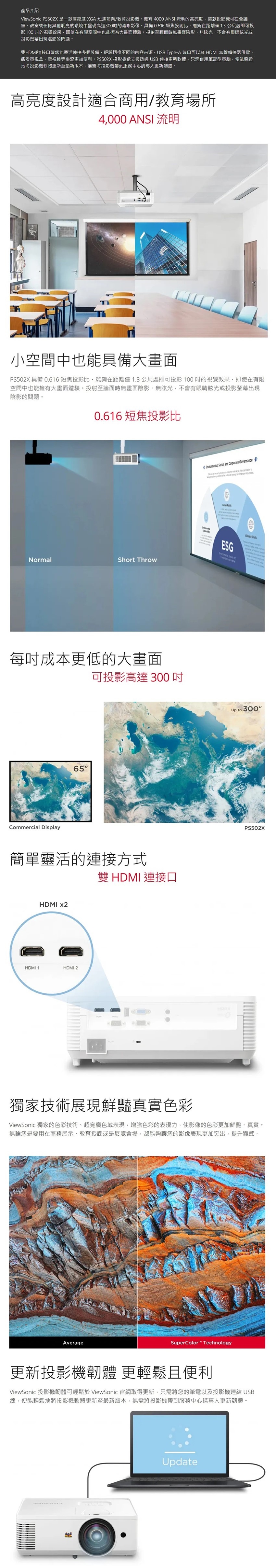 ViewSonic 優派 PS502X XGA 短焦商用投影機 4,000 流明