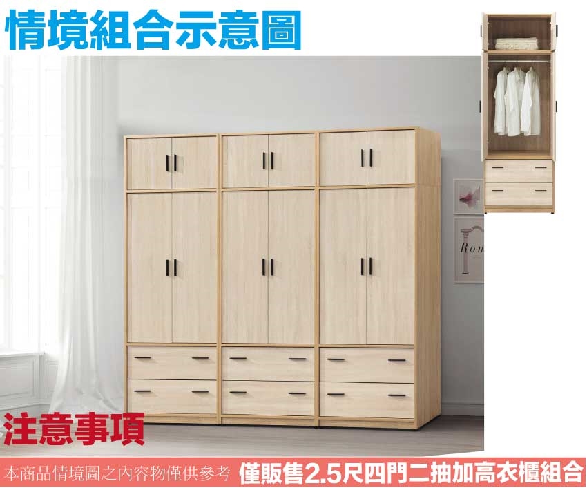 【文創集】羅比斯2.5尺四門二抽衣櫃加高組合 木紋雙色系+安心材質製造,使用放心+搭配居家更便利,採用防蛀木心板+防潮耐磨底座+五金滑軌結構+防夾手緩衝門片五金等安心材質製造 ,外層採用防潮耐磨噴漆處理搭配採用開門櫃+吊衣桿+二抽屜+內開放層格等收納空間設計,全由專人配送到家,專業安心服務,替你省下更多時間!