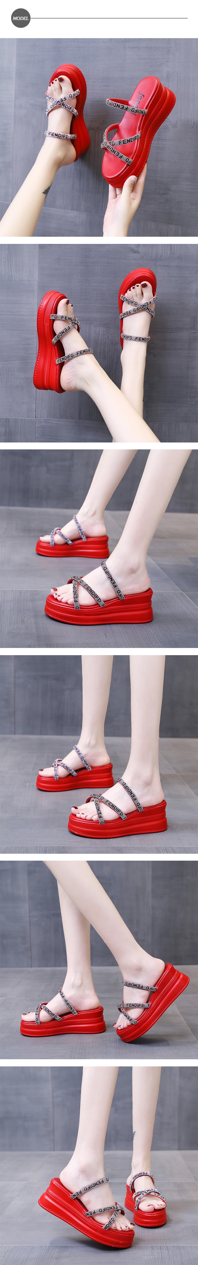 【HMH】貼鑽交叉坡跟厚底拖鞋/華麗貼鑽英文字句交叉一字帶造型坡跟厚底拖鞋 女鞋 紅