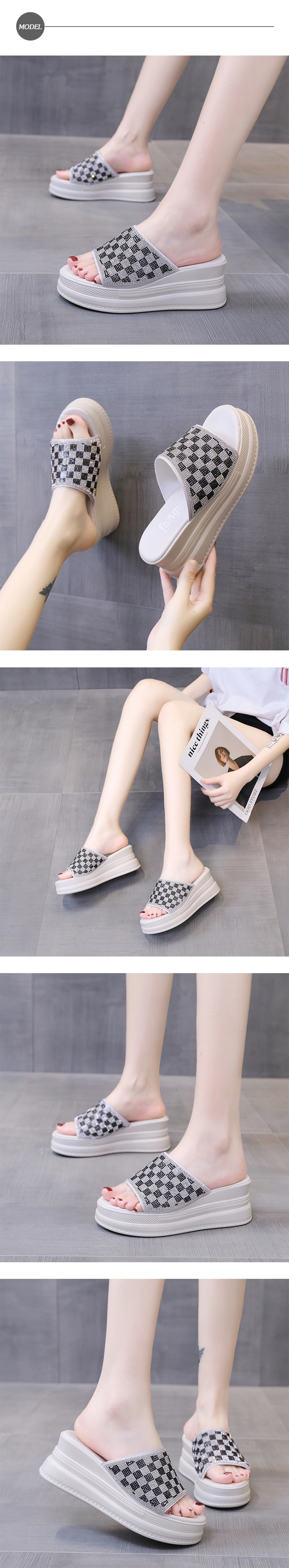【HMH】美鑽格子坡跟厚底拖鞋/閃耀美鑽撞色格子造型坡跟厚底拖鞋 女鞋 米