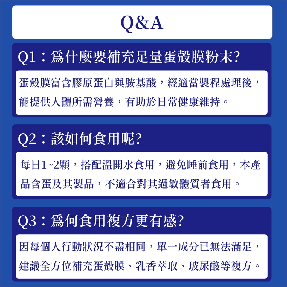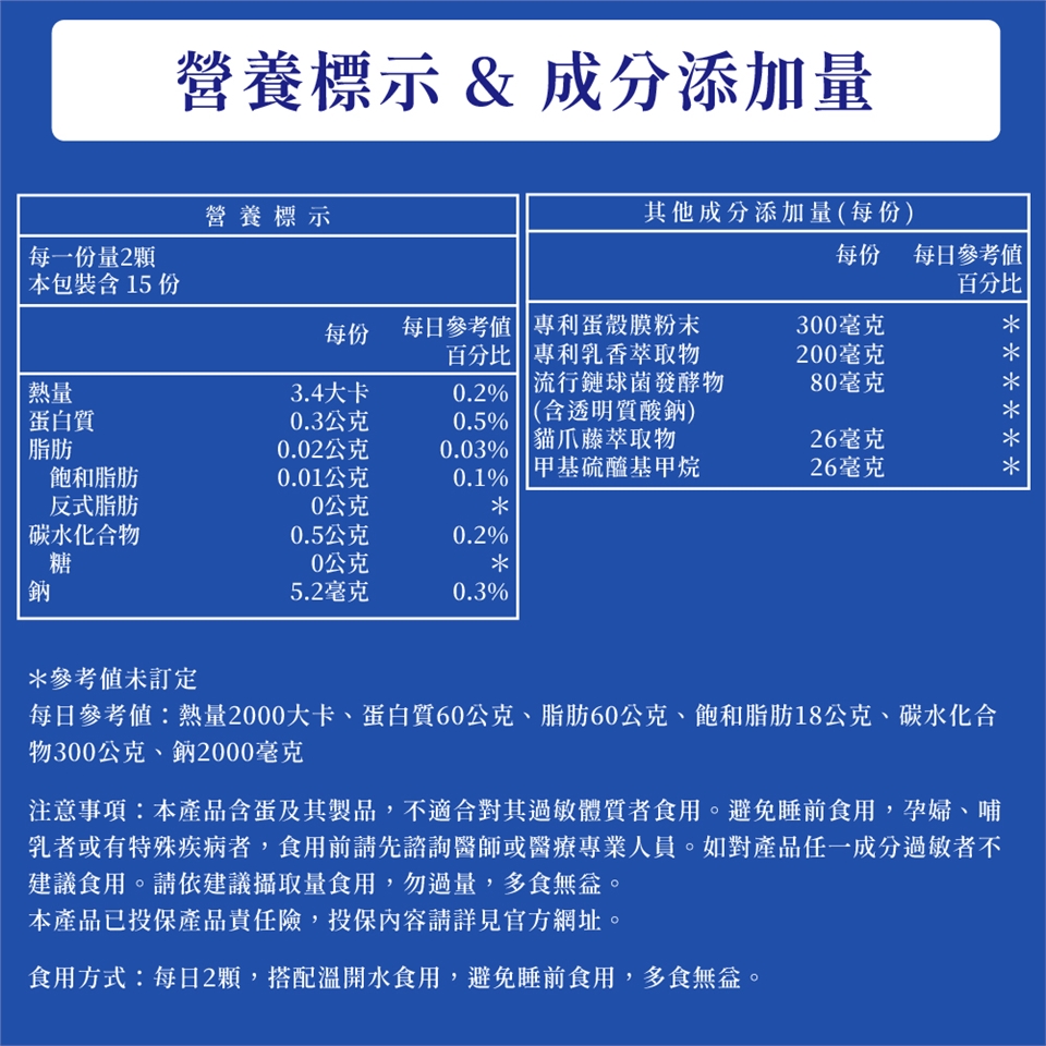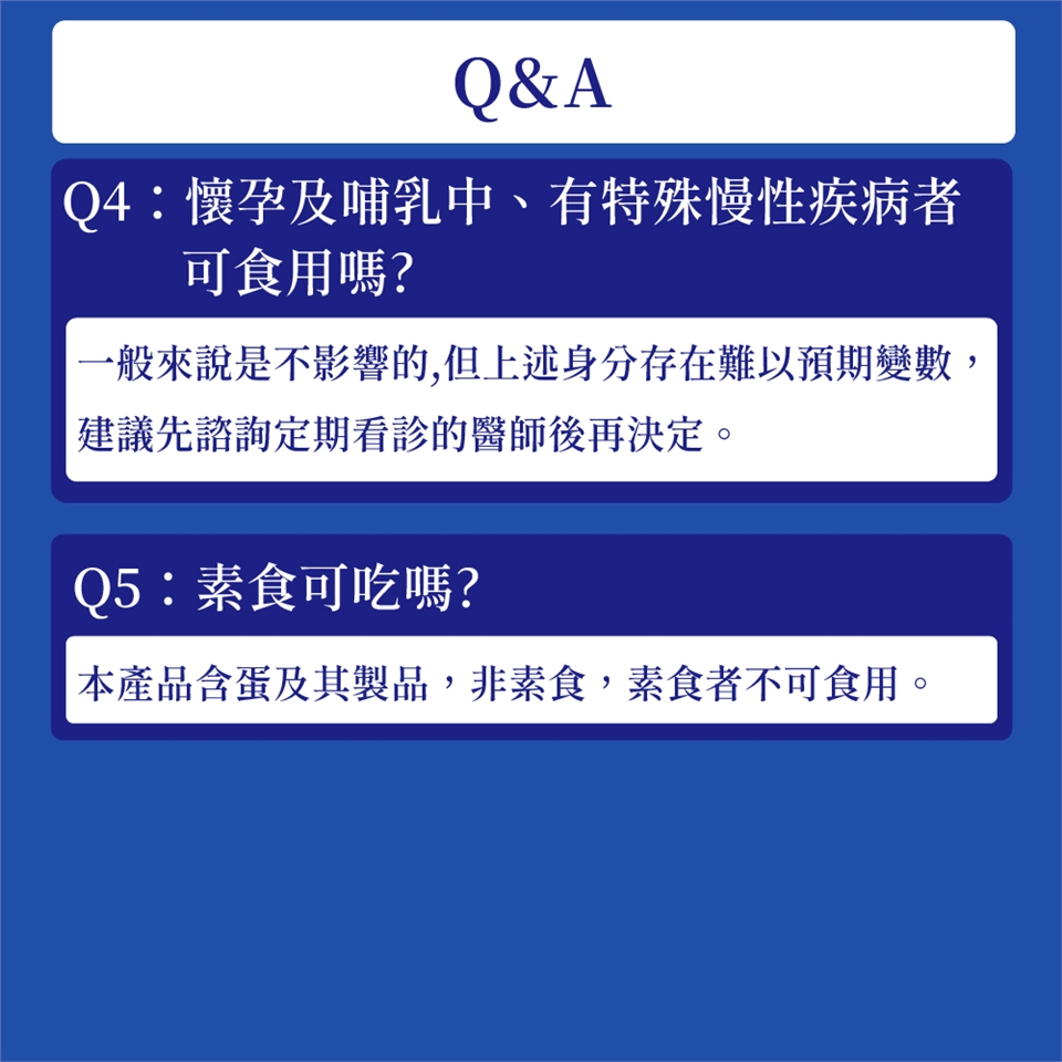 注意事項:嬰幼兒、孕婦、哺餵母乳、手術前後、患有重大疾病者如需食用本產品,請洽詢醫師或醫療專業人員。如對產品任一成分過敏者不建議食用。請依建議攝取量食用,勿過量,多食無益。