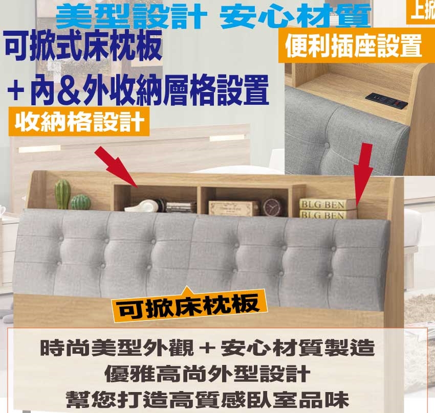 搭配床頭採用可掀式床枕板+內&外收納空間+便利插座等收納空間設計