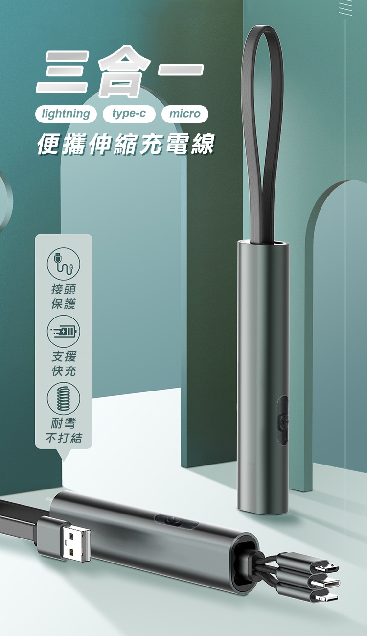 三台不同系統裝置,就要準備三條充電線?讓三合一金屬便攜伸縮充電線解決你的困擾!同時支援lightning/type-c/micro充電,設計大賞結構,防纏繞、不打結,有效保護插頭,讓您不再接觸不良或線材破皮!一條三充也沒問題!最高支援3.1A快速充電,三色可選,便攜收納外出旅遊必備款。