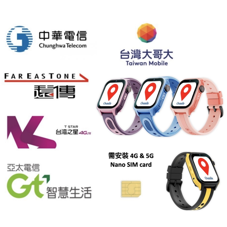 購買 Osmile ED1000 後可至中華電信 / 台灣大哥大/ 遠傳 / 亞太 / 台灣之星 購買 (4G / 5G) Nano SIM Card 安裝後即可使用