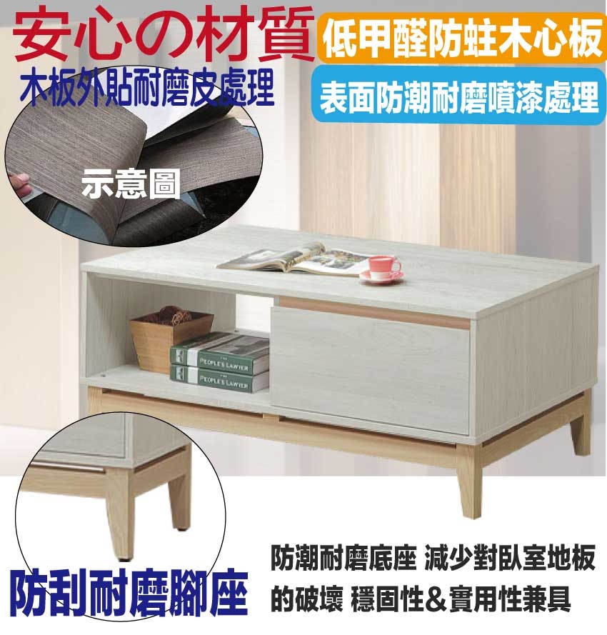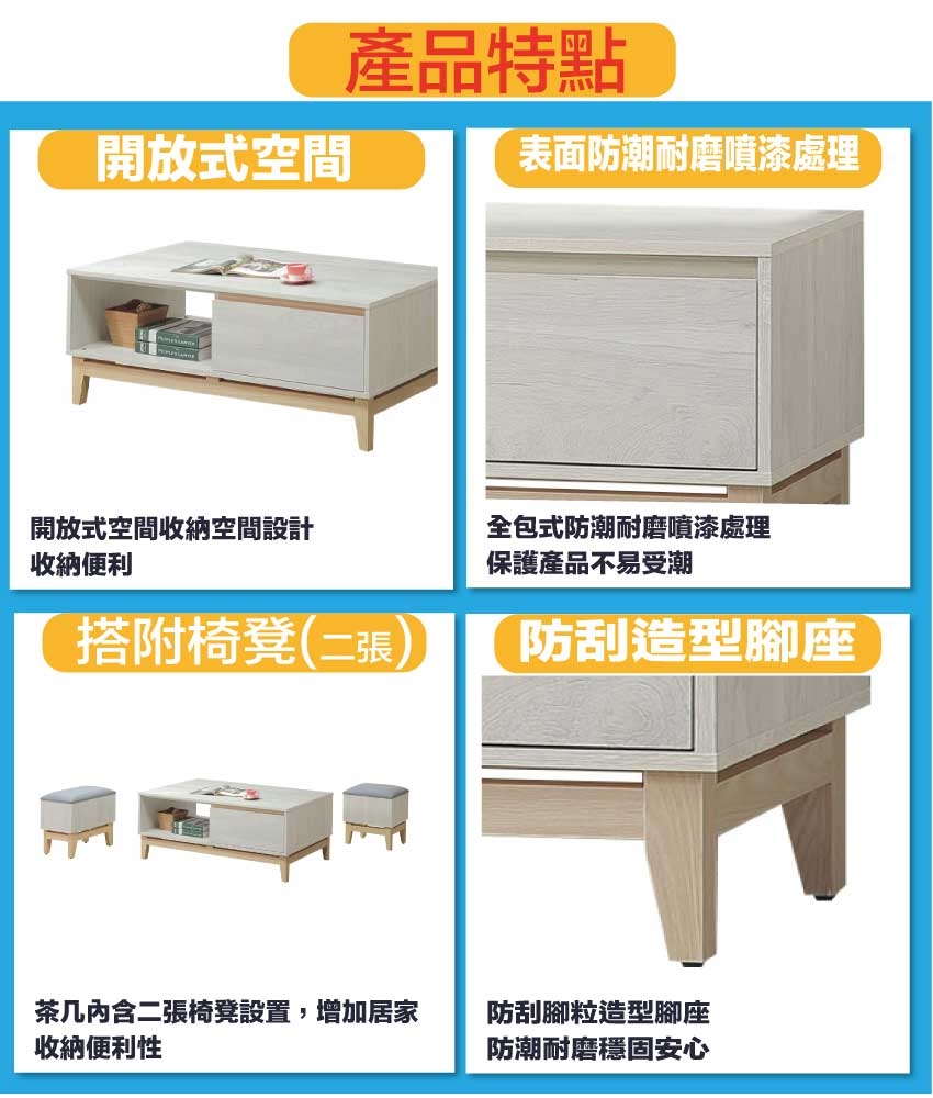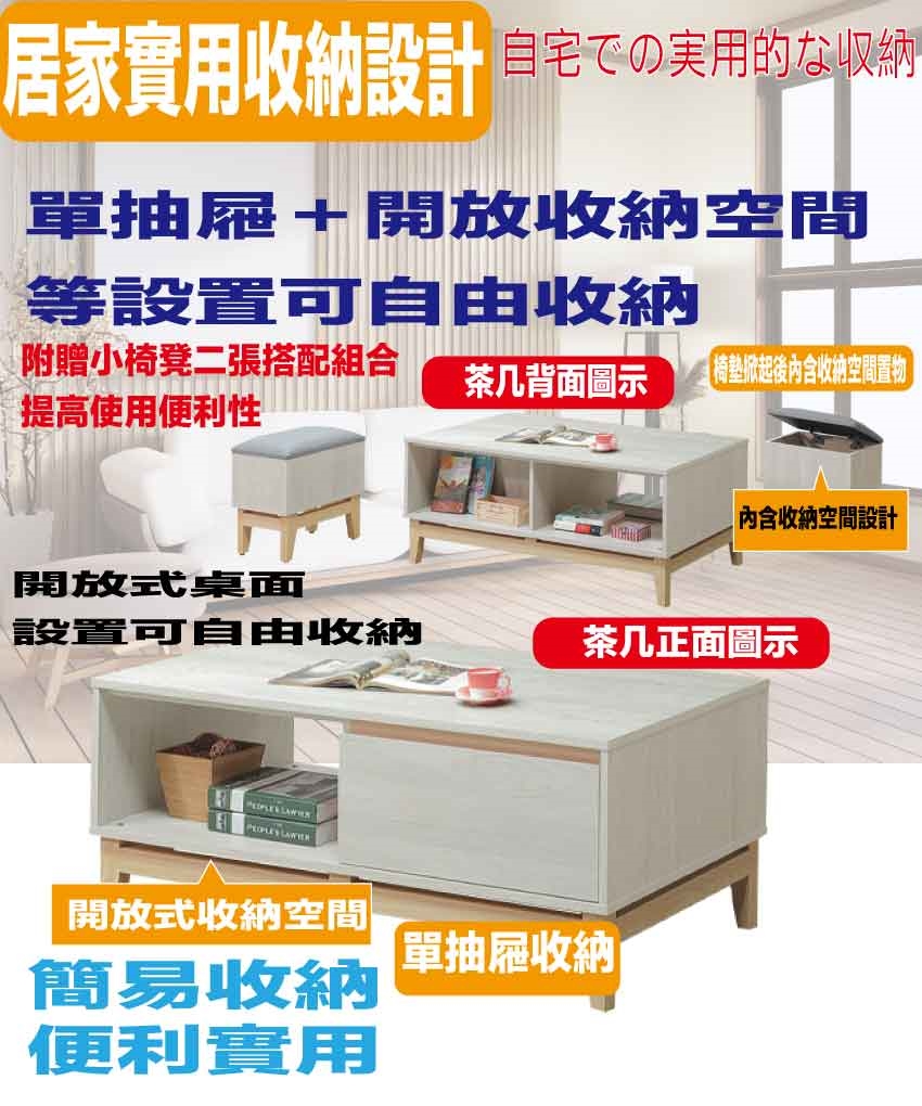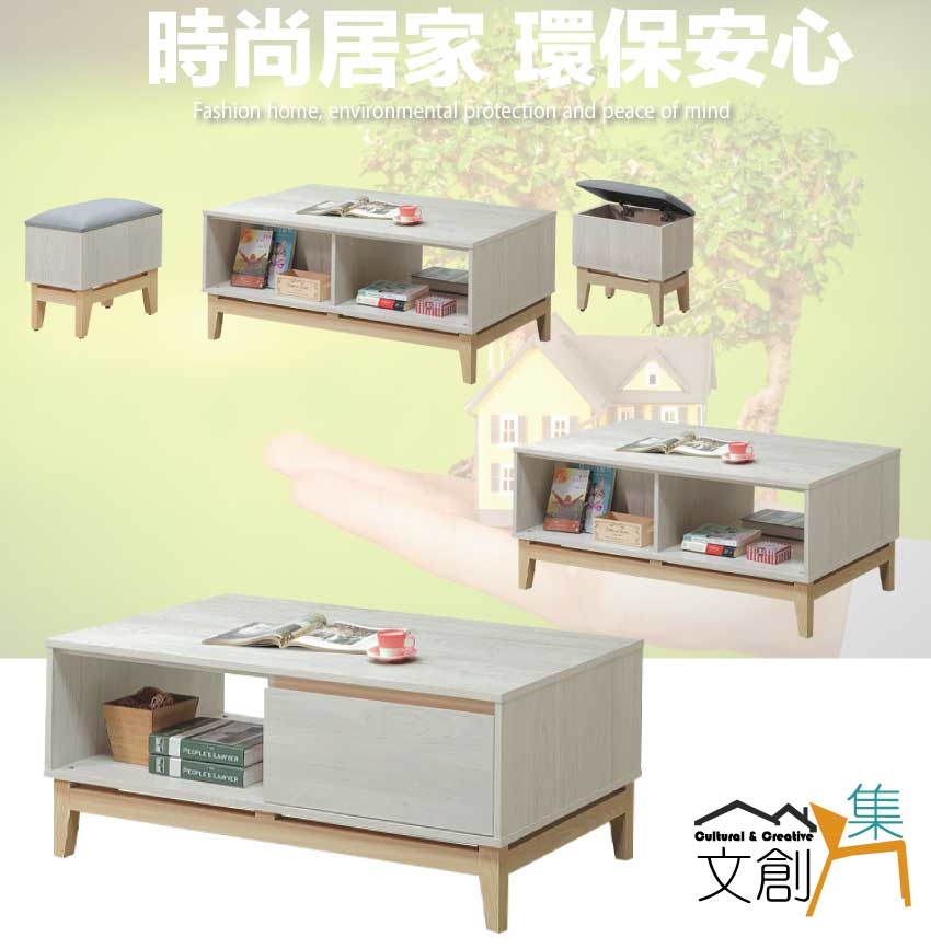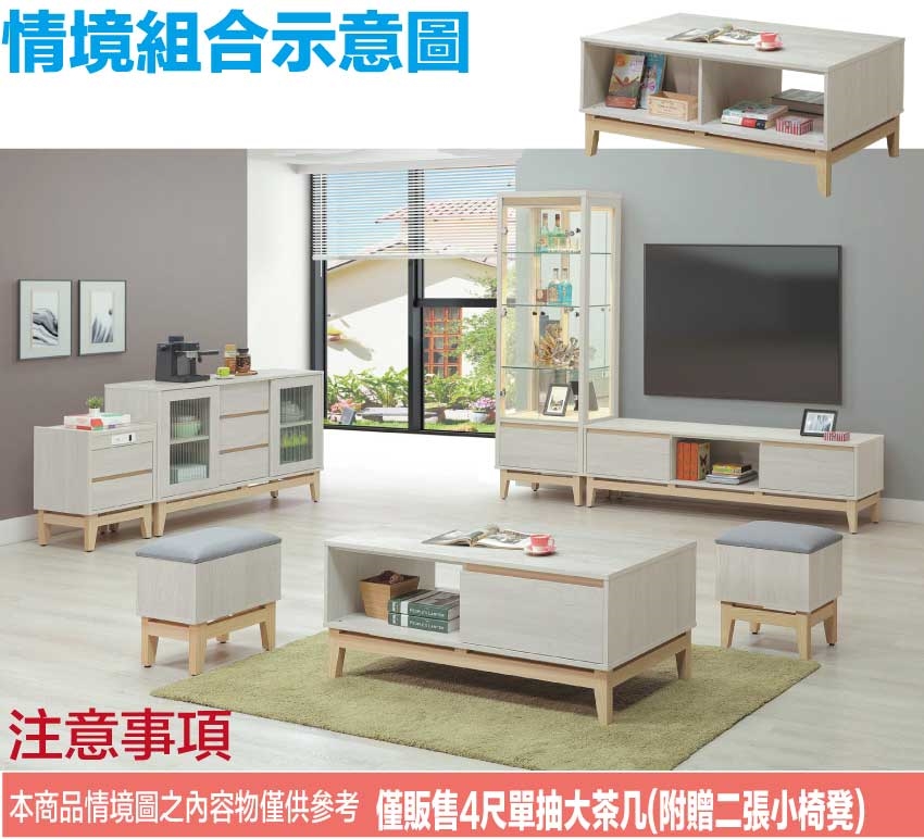 【文創集】歌斯4尺單抽大茶几(附收納椅凳二張) 淺橡雙色系+安心材質製造,使用放心+搭配居家更便利,採用防蛀木心板+防潮耐磨腳座+五金滑軌結構等安心材質製造 ,外層採用防潮耐磨噴漆處理搭配採用單抽屜+開放式層格+附收納椅凳二張等收納空間設計,全由專人配送到家,專業安心服務,替你省下更多時間!