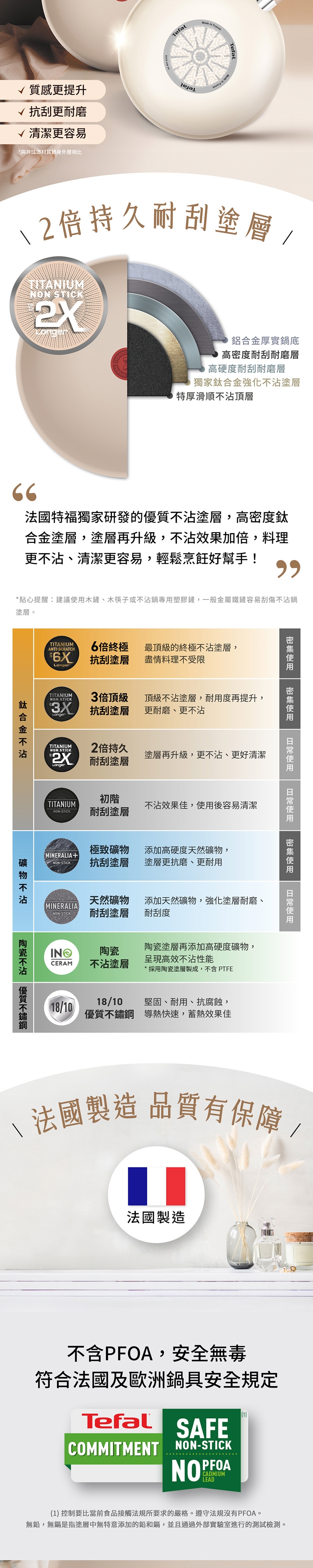 特福獨家研發的Titanium 2X 不沾塗層配方,添加鈦合金微粒子,極強效抗磨耐刮,不沾效果佳又好清洗!