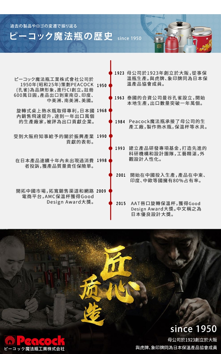 日本孔雀Peacock母公司於1923年創立於大阪,從事保溫瓶生產。與虎牌、象印牌同為日本保溫產品協會成員。