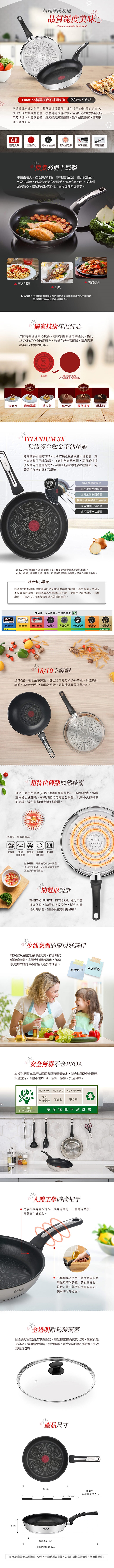不鏽鋼鍋身經久耐用,蓄熱儲溫效果佳,鍋內採用Tefal獨家的TITANIUM 3X抗刮鈦金塗層,抗磨耐刮表現出眾,佳溫紅心的理想溫度指示及快速均勻導熱底部,讓您輕鬆料理展現廚藝,激發創意靈感,實現料理的各種可能。