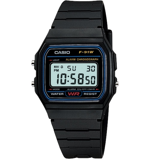 CASIO F-91W全新系列外觀以復古造型設計,方型簡約的錶面設計讓各種穿搭風格皆能搭配,全系列皆為樹脂錶帶,並具備防水功能、1/100秒計時碼表、每日鬧鈴、LED背光照明、全自動月曆、12/24小時制切換等多項功能。
