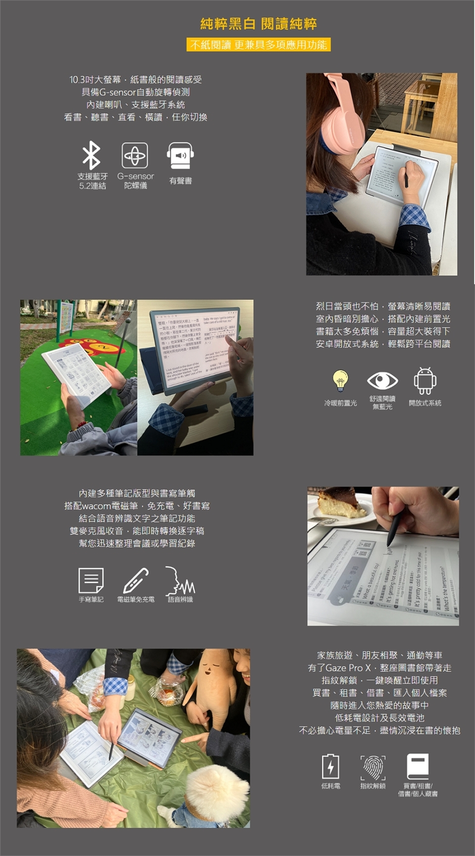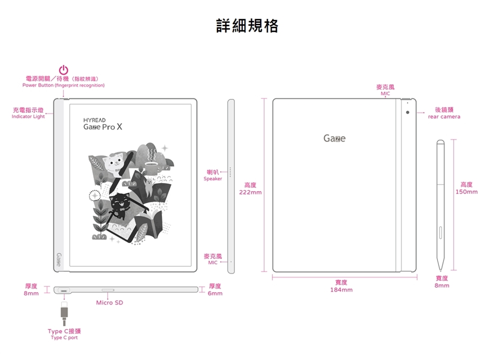 螢幕特性:電子紙閱讀器採E Ink電子紙顯示器,如紙般輕薄,由塑膠薄膜及薄玻璃製成,與生活中使用的LCD螢幕完全不同,無法承受外力撞擊、摔落、單點施壓、物品重壓等,皆可能造成螢幕損壞,請您使用上務必留意。