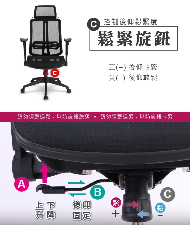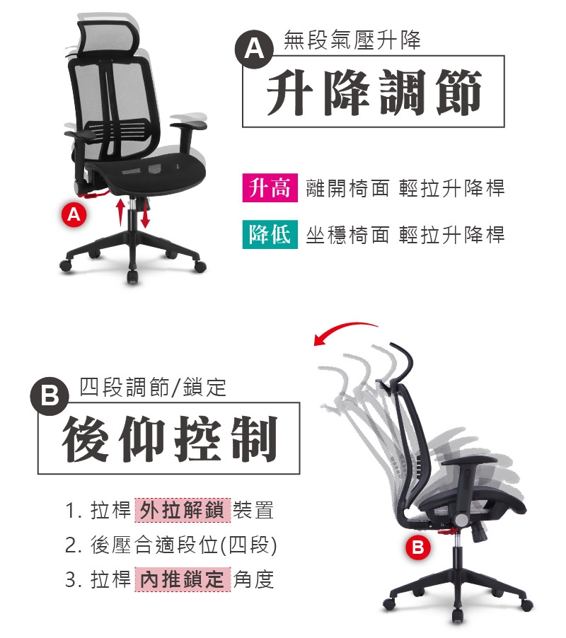 四段後仰可依需求調整,調節桿內推即鎖定,防止回彈機制,確保穩定性。
