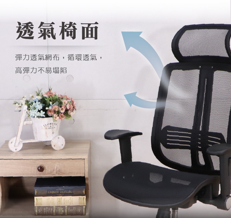 椅背、坐墊與頭枕皆採用網布,高彈力不易塌陷,實現全椅循環透氣。