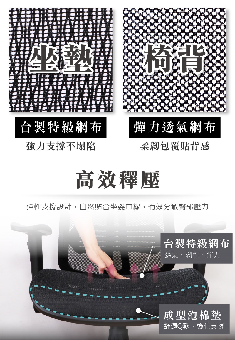 坐墊材質:台製特級網布+(前緣)成型泡棉