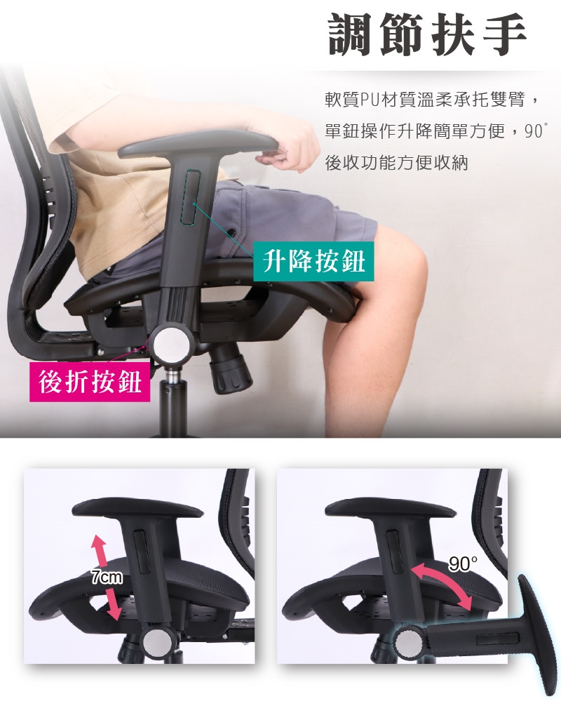 軟質PU材質溫柔承托雙臂,單鈕操作簡單方便,隨需調整。