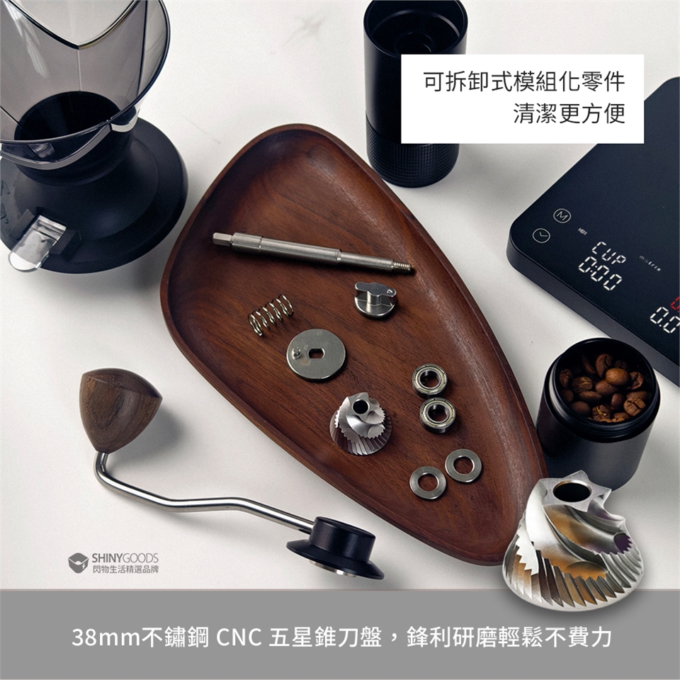 材質:本體-太空鋁 / 粉杯-太空鋁 / 手把握把-實木 / 手把搖桿-不鏽鋼 / 中軸:303不鏽鋼 / 刀盤:不鏽鋼