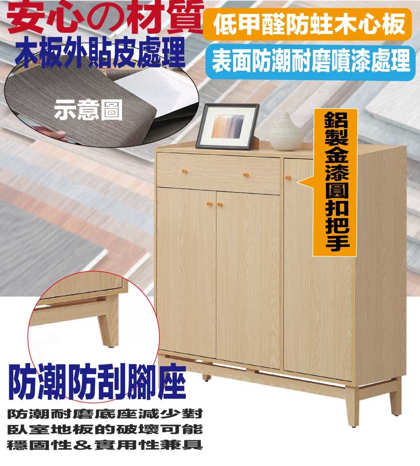 【文創集】萬斯4尺三門單抽鞋櫃 橡木紋色系+安心材質製造,使用放心+搭配居家更便利,採用防蛀木心板+防潮耐磨腳座+五金滑軌結構+防夾手緩衝五金等安心材質製造 ,外層採用防潮耐磨噴漆處理搭配採用開門櫃+單抽屜+內開放式層格等收納空間設計,全由專人配送到家,專業安心服務,替你省下更多時間!
