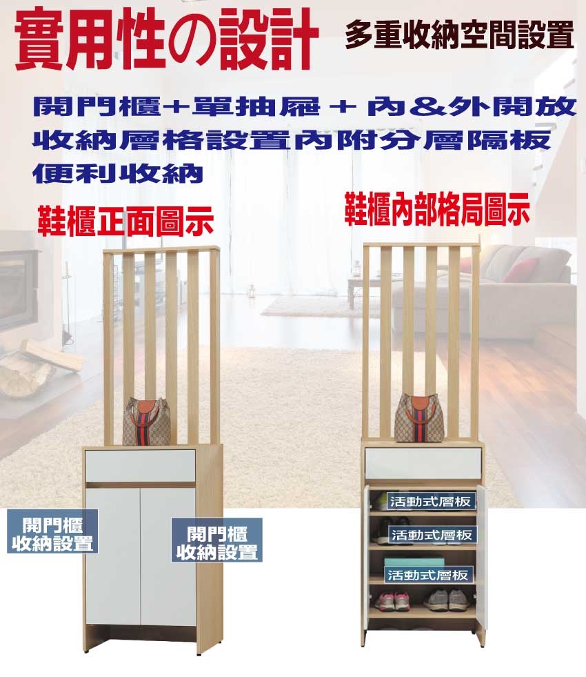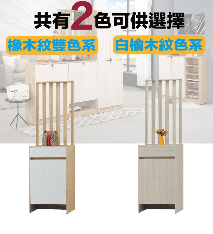 【文創集】美斯2尺二門單抽高玄關屏風鞋櫃(二色可選) 二色可選+安心材質製造,使用放心+搭配居家更便利,採用防蛀木心板+防潮耐磨底座+防夾手緩衝門片五金等安心材質製造 ,外層採用防潮耐磨噴漆處理搭配採用開門櫃+單抽屜+開放式層格等收納空間設計,全由專人配送到家,專業安心服務,替你省下更多時間!