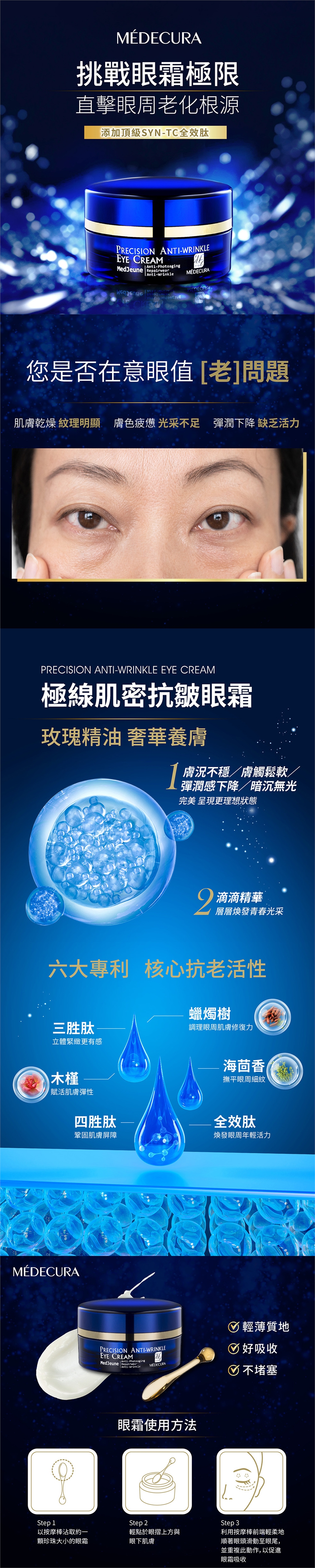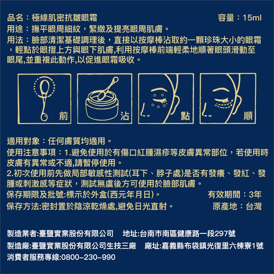 眼霜:臉部清潔基礎調理後,直接以按摩棒沾取約一顆珍珠大小的眼霜,輕點於眼摺上方與眼下肌膚,利用按摩棒前端輕柔地順著眼頭滑動至眼尾,並重複此動作,以促進眼霜吸收。