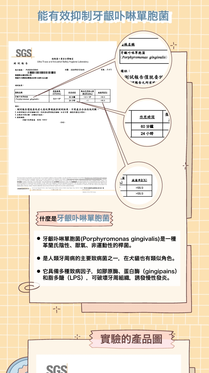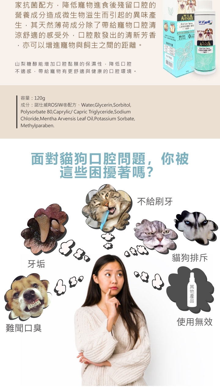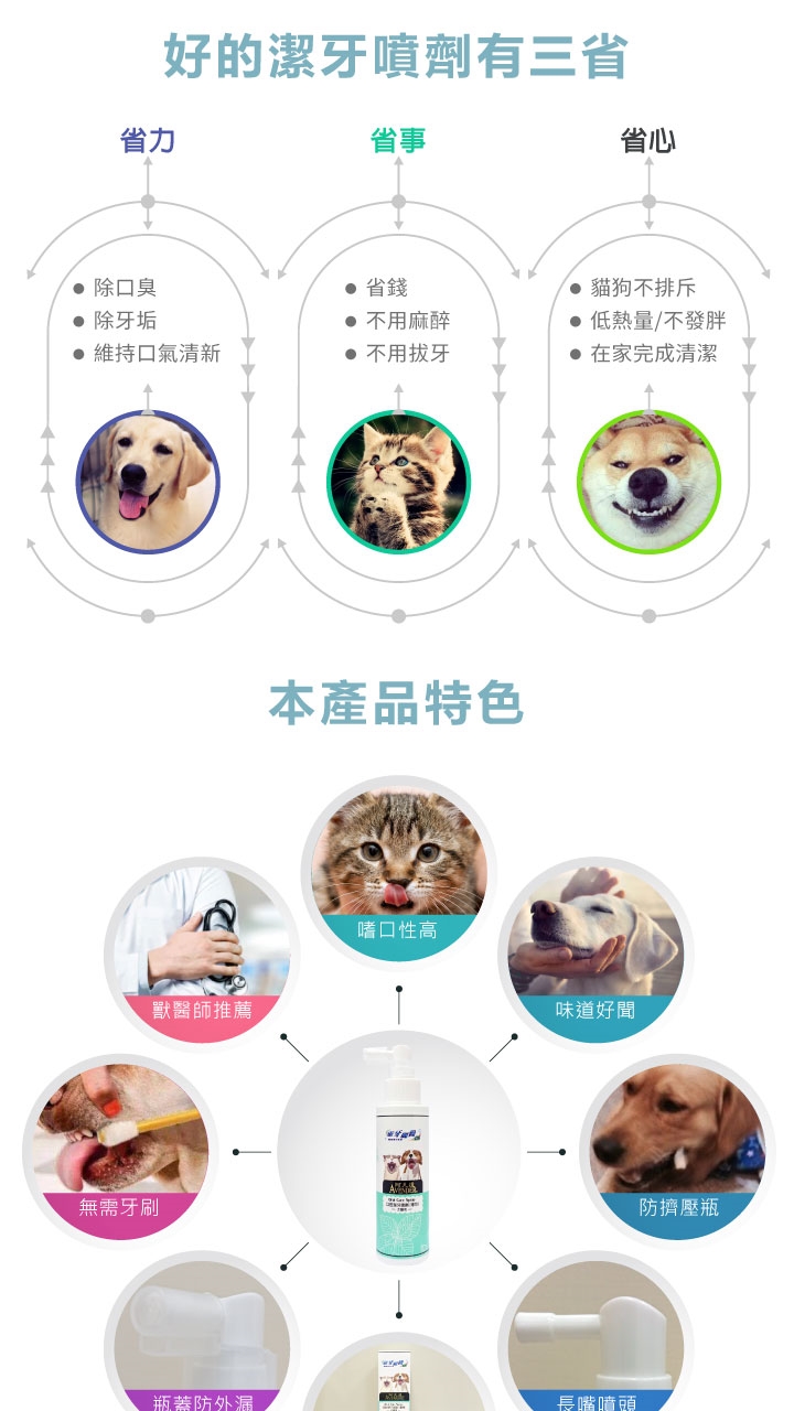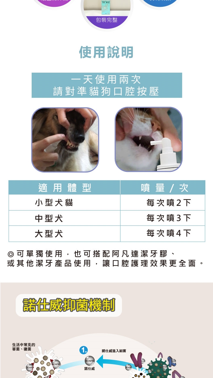 商品詳細介紹 體驗說明 不可體驗 使用方法說明 一天使用兩次,請對準貓狗口腔按壓。小型犬猫每次噴2下;中型犬每次噴3下;大型犬每次噴4下。 注意事項 僅供寵物使用。如有異常現象,請停止使用,並洽詢獸醫師。