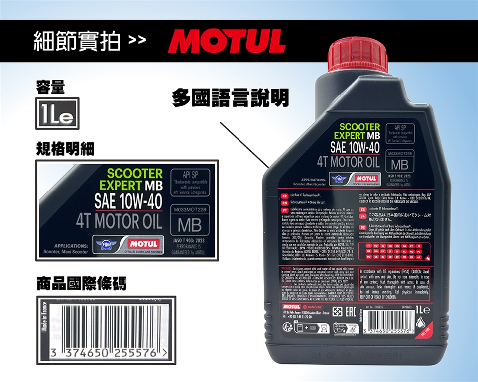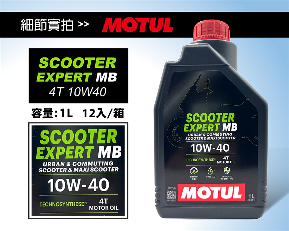 MOTUL Scooter Expert 4T MB 10W-40 是專為現代速克達和大型速克達設計的4行程全合成機油,適用於無濕式離合器的引擎。這款機油能有效減少內部摩擦,提升引擎效率,並提供卓越的保護,非常適合城市騎行和日常通勤。