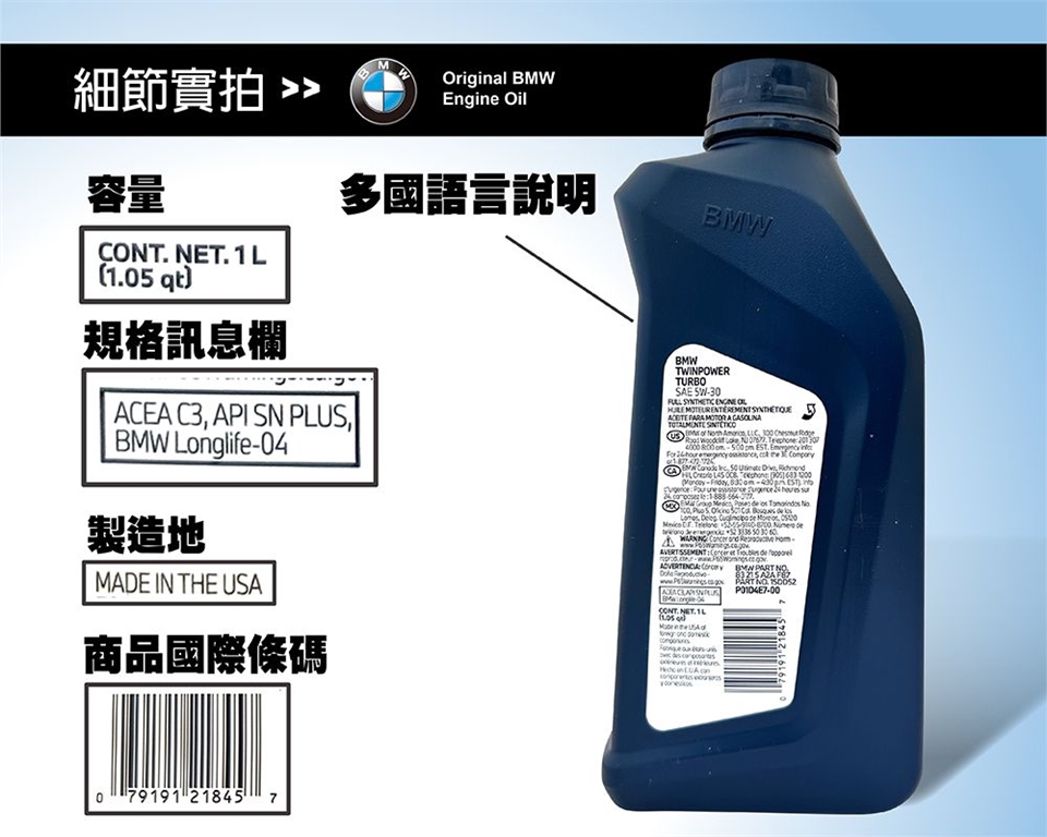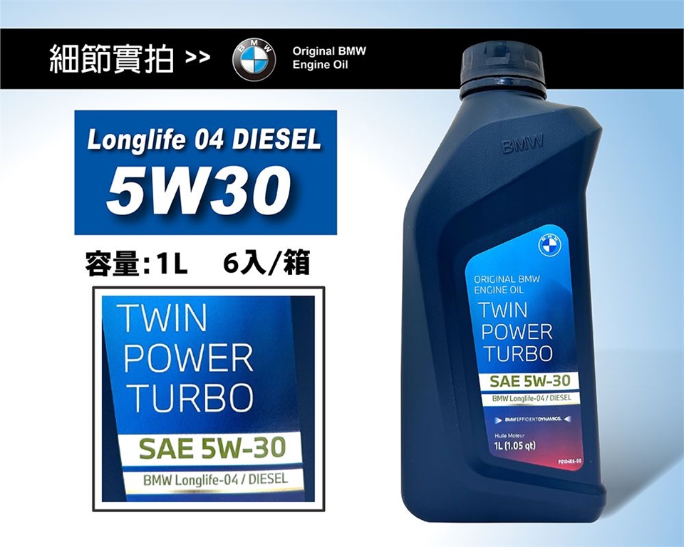 BMW TwinPower Turbo Longlife‑04 SAE 5W‑30 是 BMW 原廠全合成引擎機油,採用專門為 BMW 現代汽柴油渦輪增壓引擎(含粒子過濾器與直噴系統)設計的配方,可提升動力表現與燃油效率,並提供優異冷啟動保護與穩定性 。此油品符合 BMW Longlife‑04 規格,適用於多款歐規與美規柴油引擎,也是符合 API SN 與 ACEA C3 標準的高品質機油。