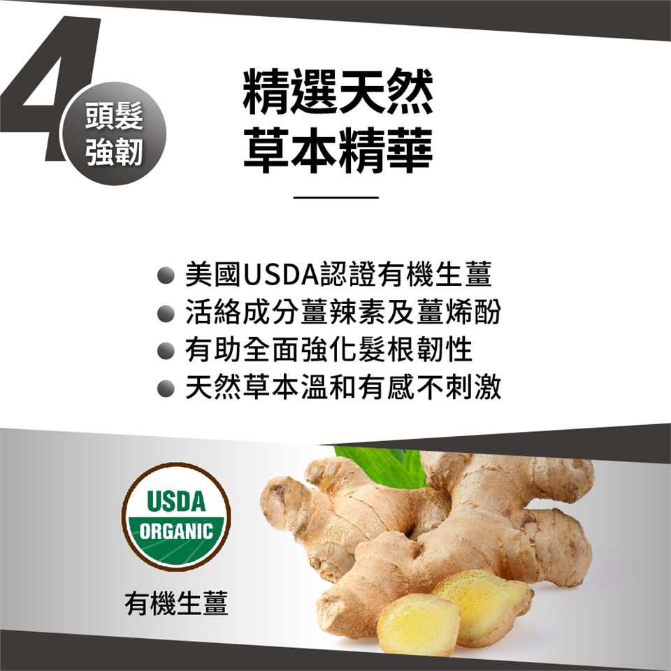 4.三大天然草本精華 :高濃度咖啡因鞏固髮根、美國USDA認證有機生薑賦活韌性、10倍濃縮鋸棕櫚濃密亮髮。