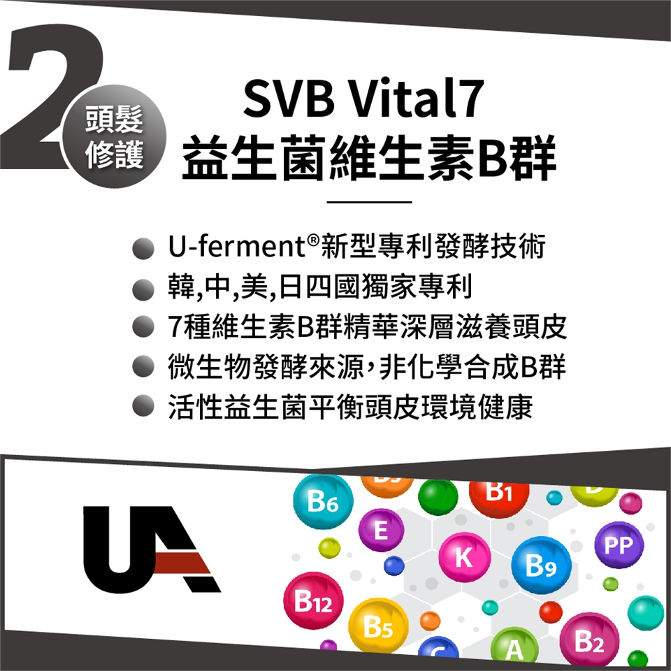 2.四國專利益生菌維生素B群:U-ferment®專利發酵技術、天然生物素B群滋養頭皮、活性益生菌平衡頭皮環境。