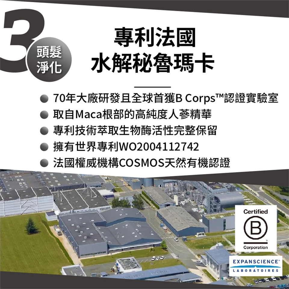 3.專利法國水解秘魯瑪卡 :70年大廠B Corps™認證實驗室研發、取自人蔘精華強韌髮根、擁有世界專利萃取技術。