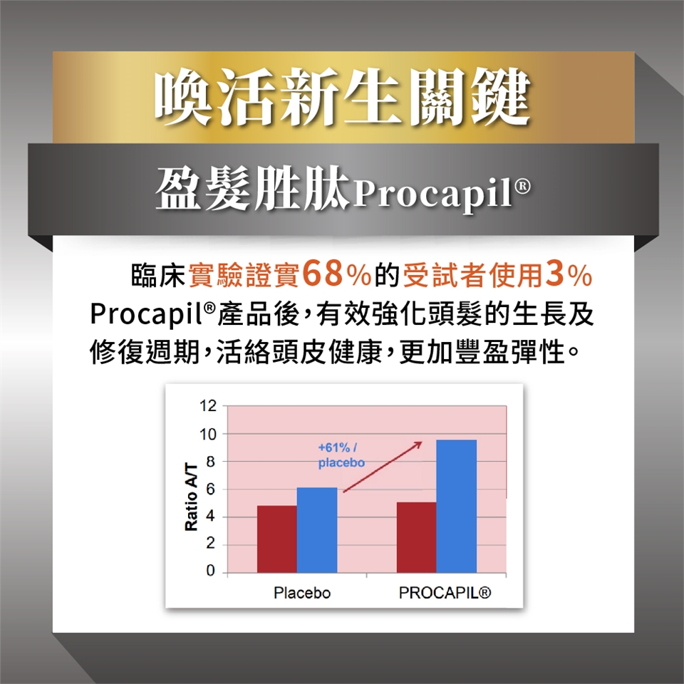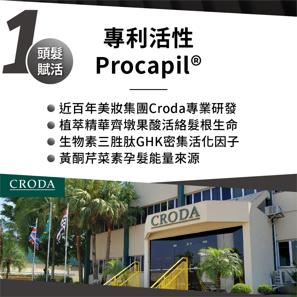 1.德國專利活性Procapil® : 百年美妝集團Croda專業研發、植萃精華果酸活絡髮根、胜肽小分子吸收力加倍,喚醒髮根生命力。