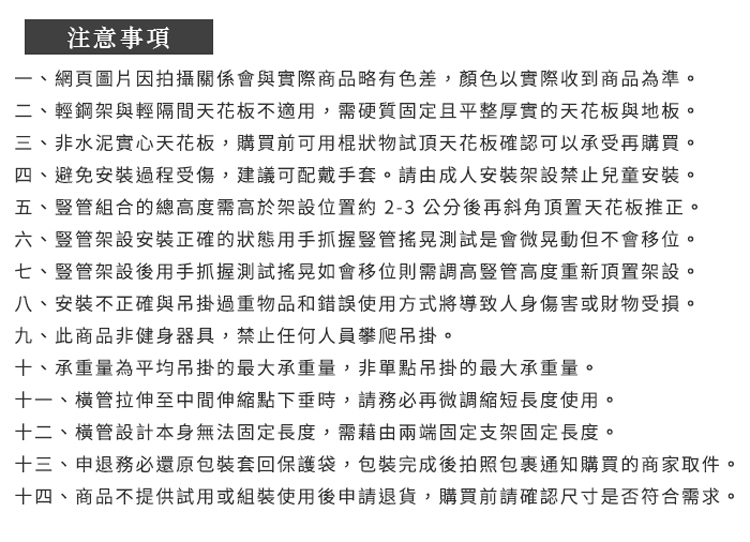 三、非水泥實心天花板,購買前可用棍狀物試頂天花板確認可以承受再購買。