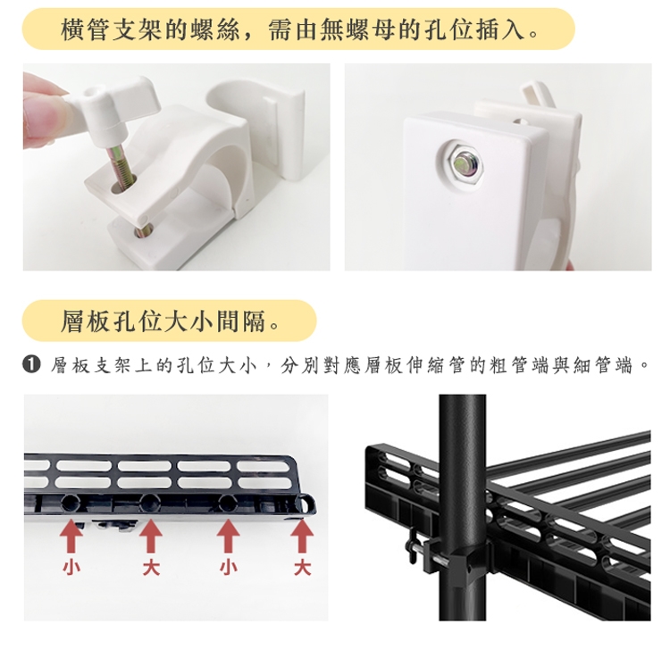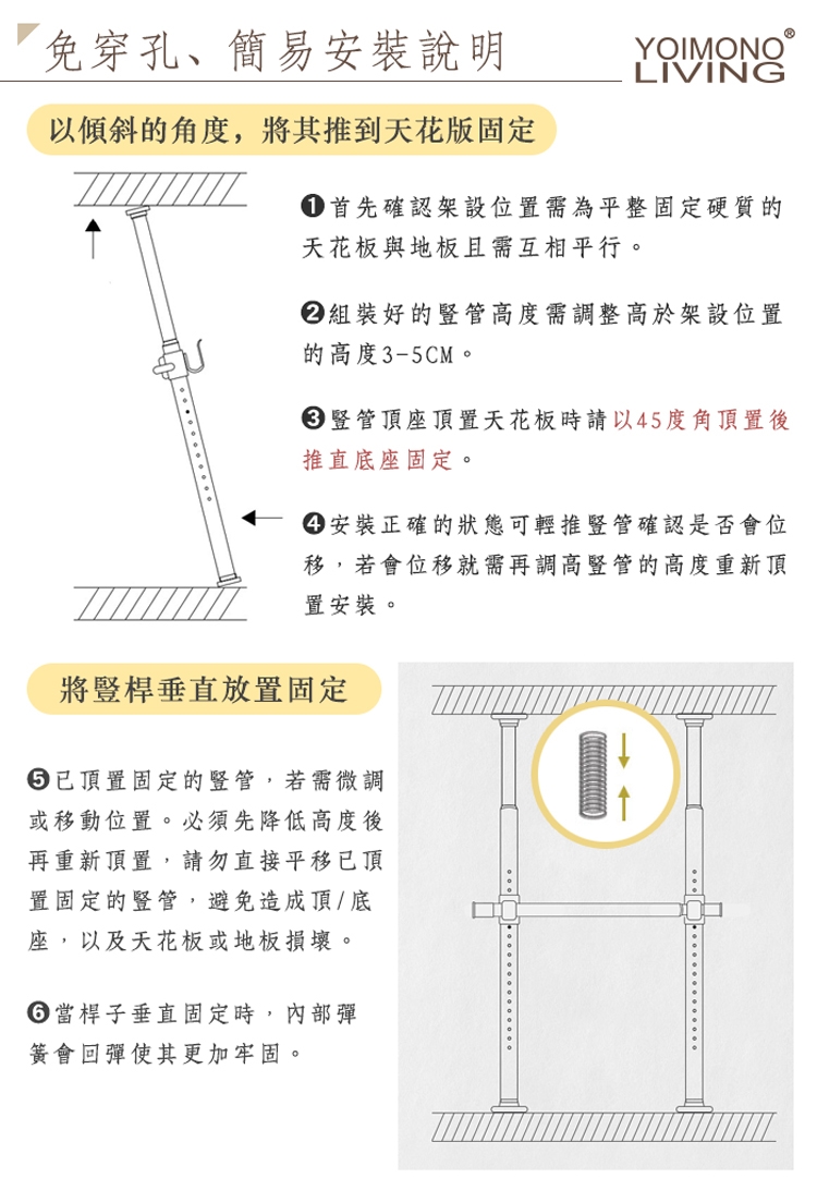 五、豎管組合的總高度需高於架設位置約 2-3 公分後再斜角頂置天花板推正。